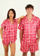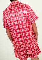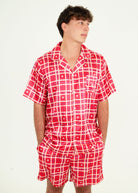Mens Starry Tartan Red Satin Short Sleeve/Long Pants Pyjama Set