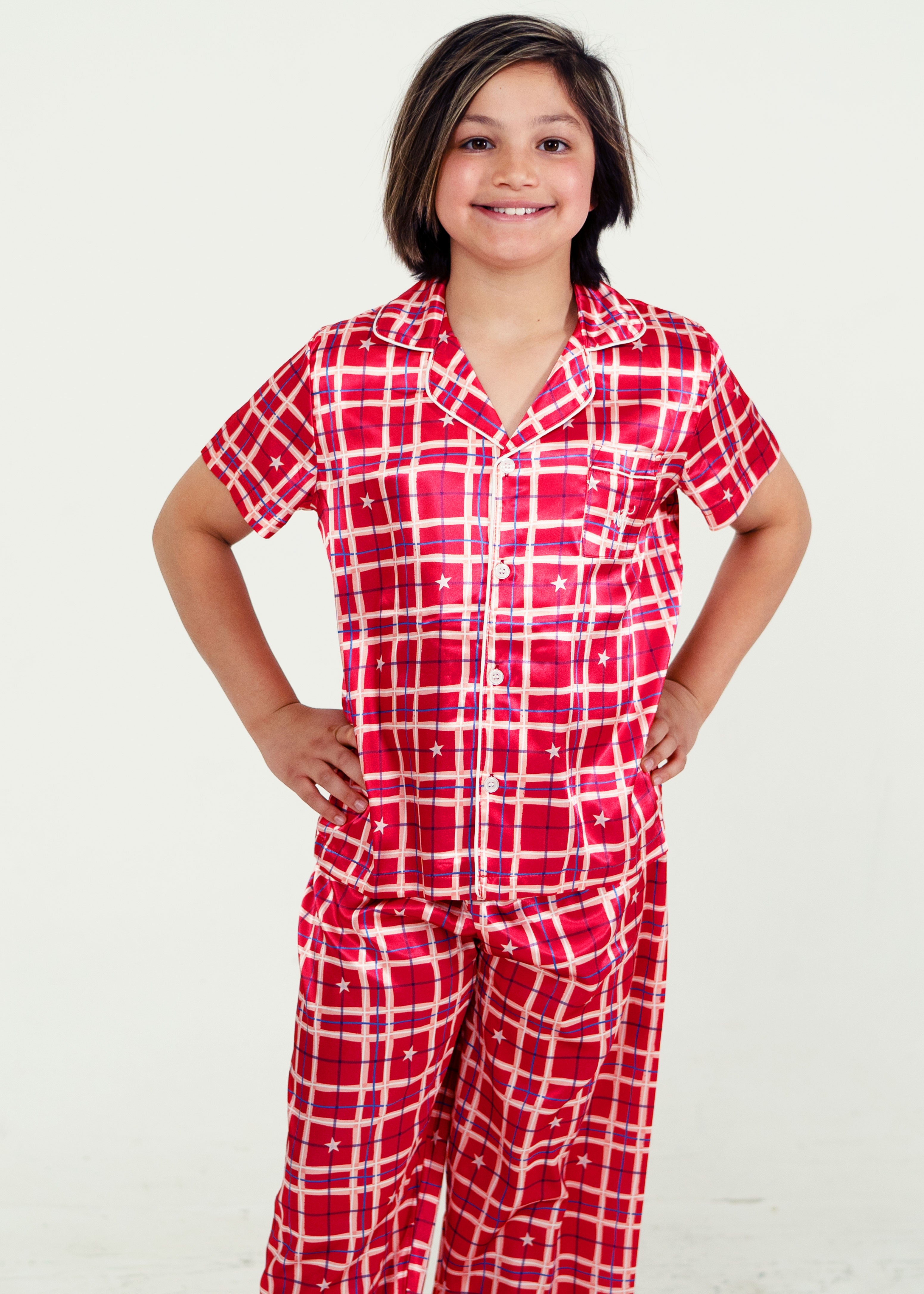 Boys Starry Tartan Red Satin Short Sleeve/Long Pants Pyjama Set