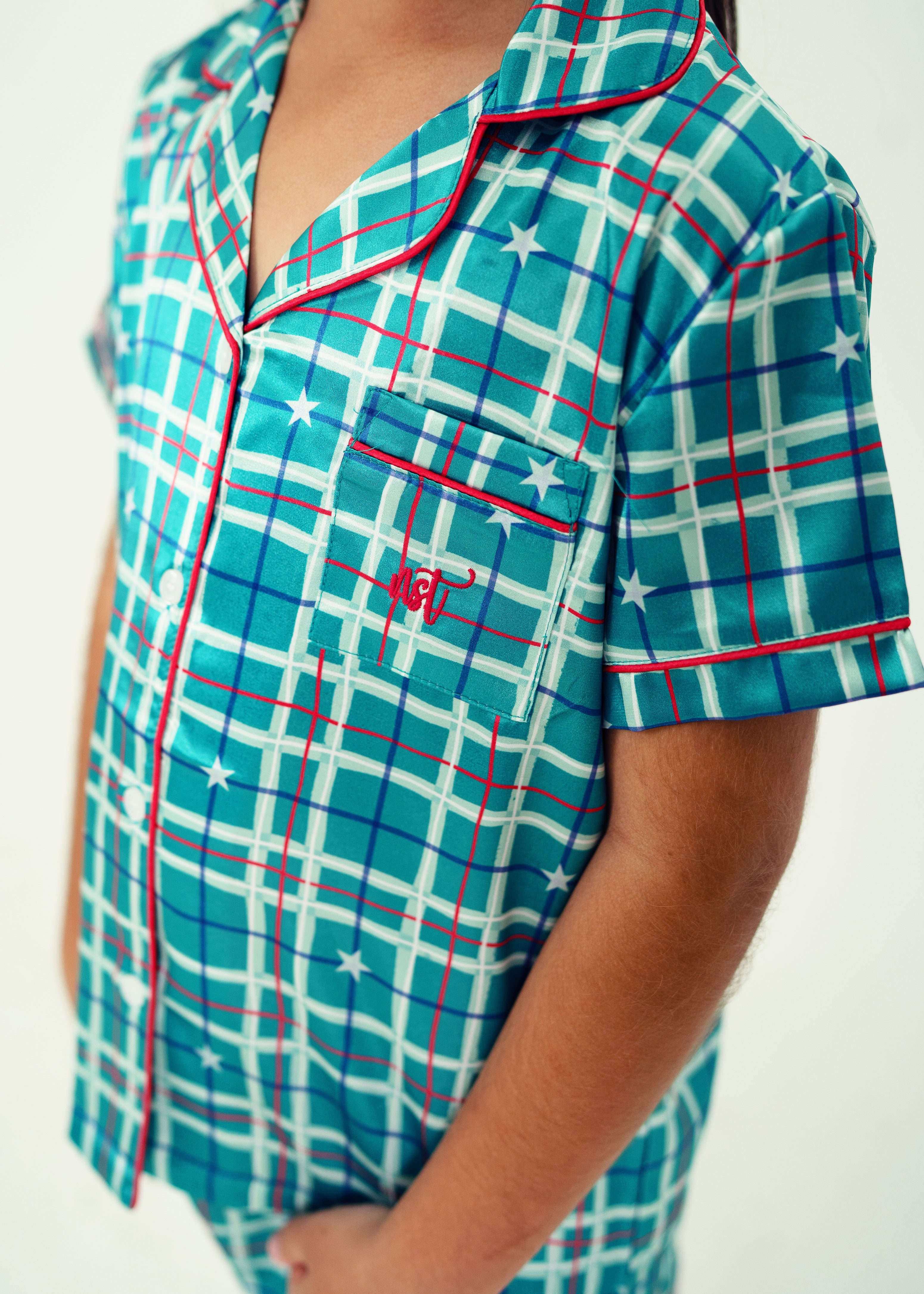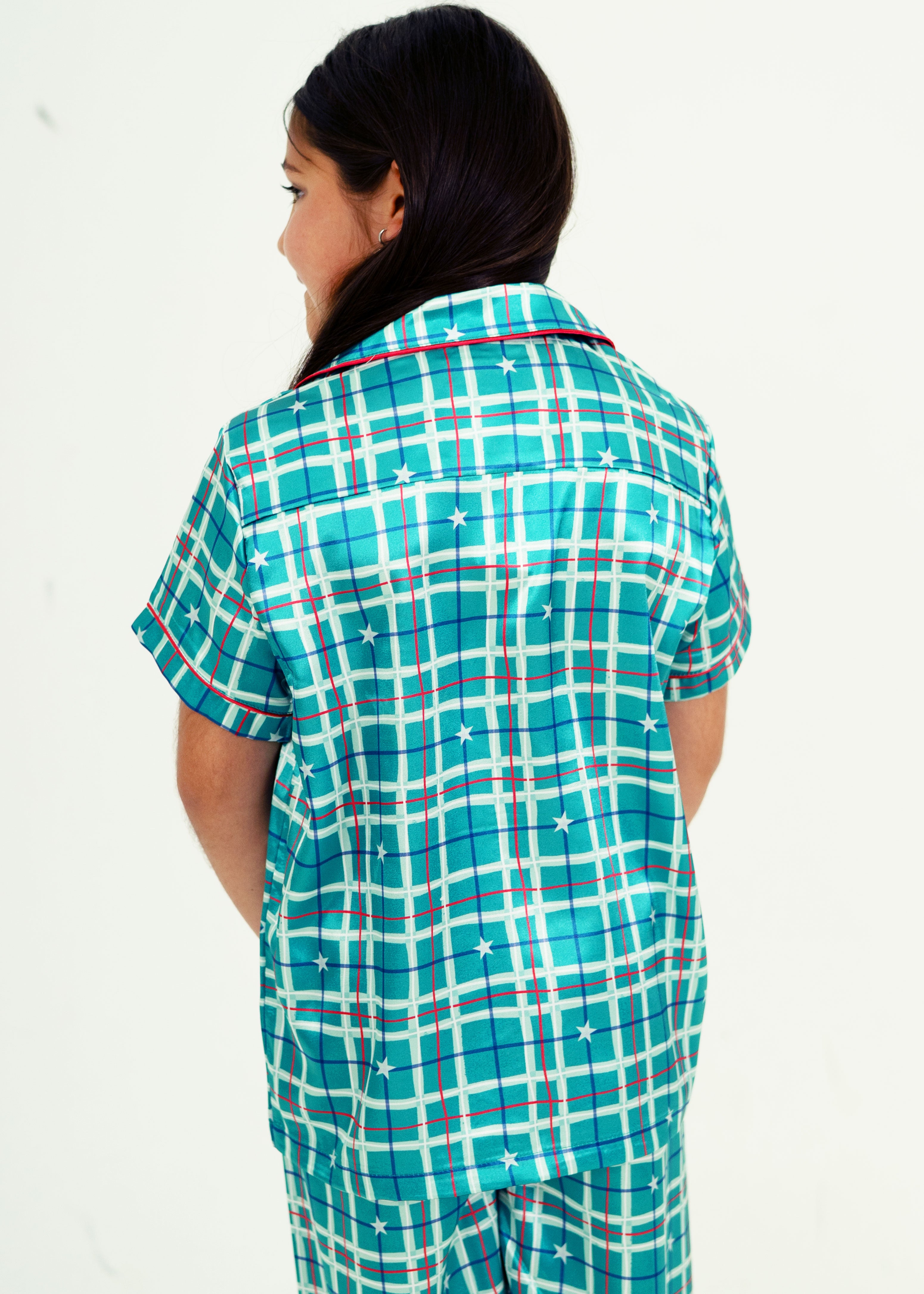Girls - Starry Tartan Green Satin - Short Top/Long Pants PJ Set