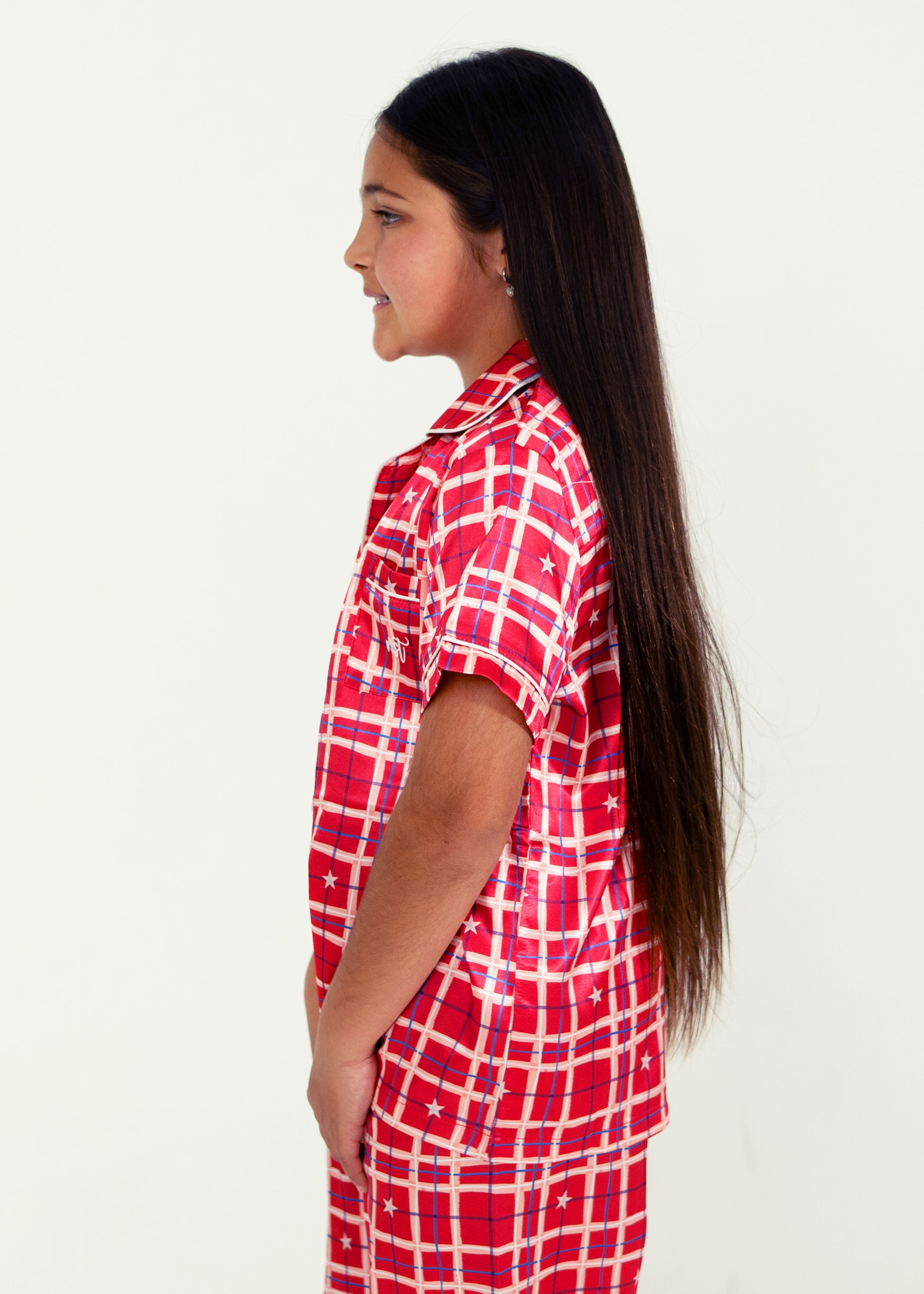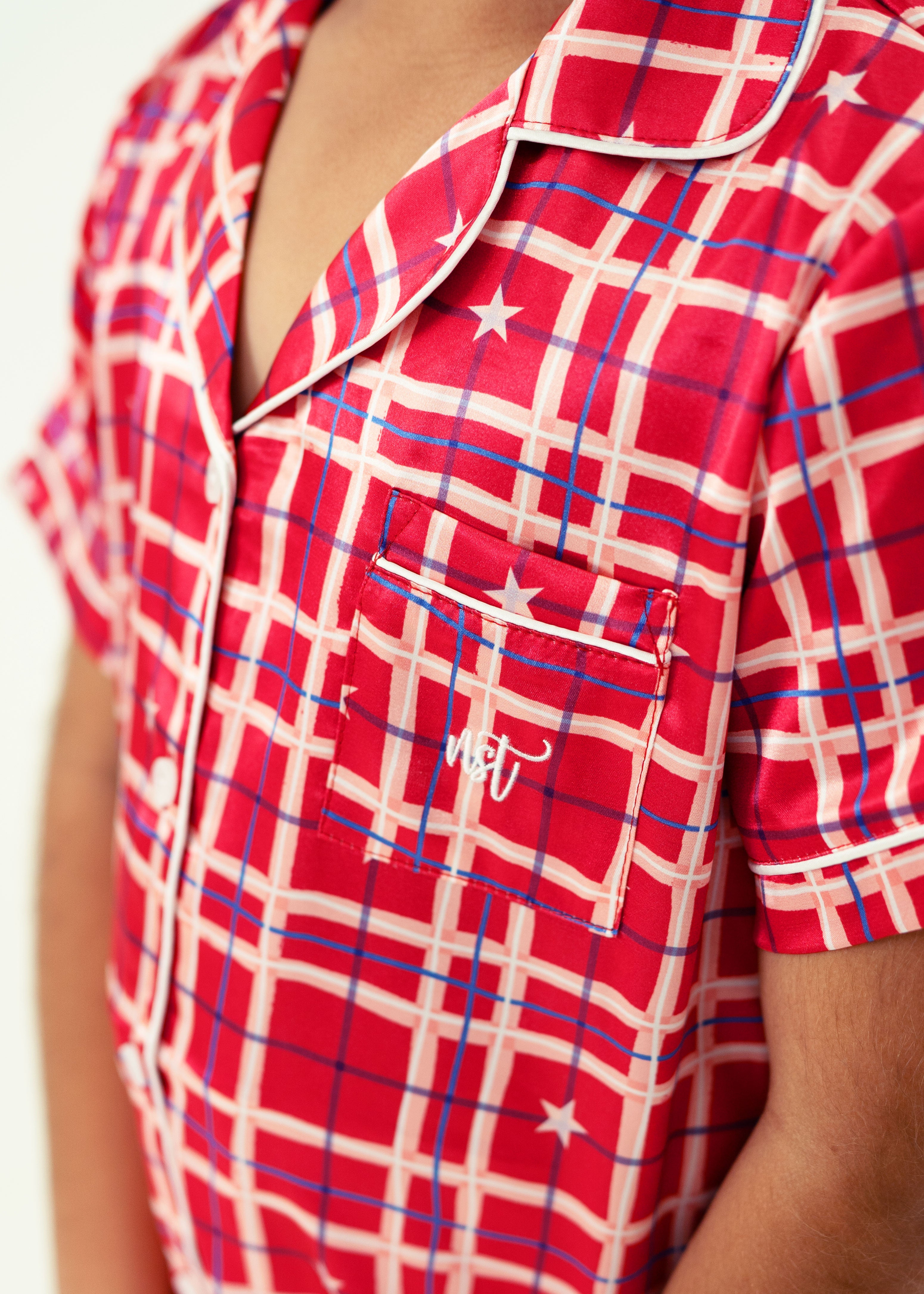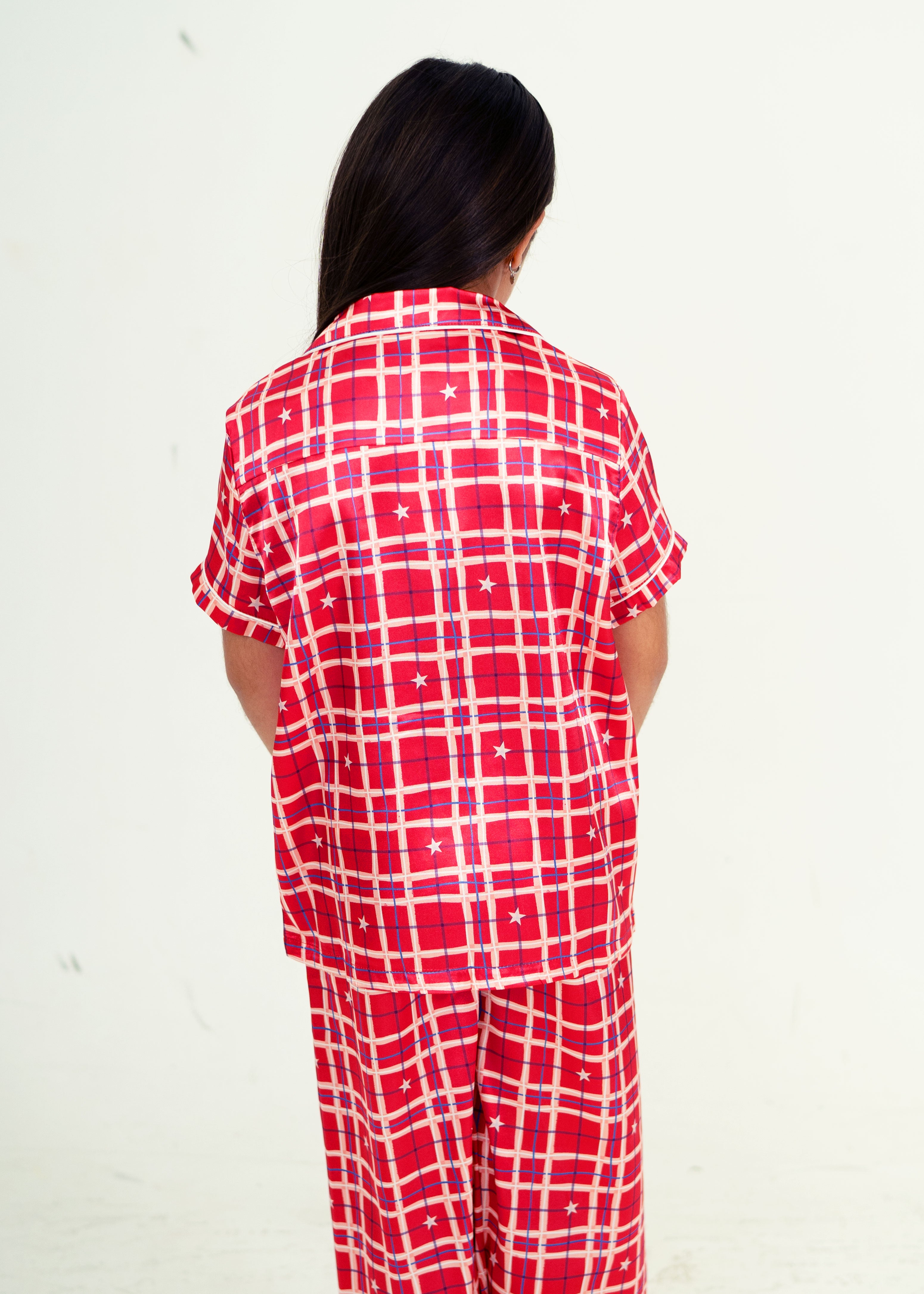 Girls - Starry Tartan Red Satin Short Top/ Long Pants Pyjama Set