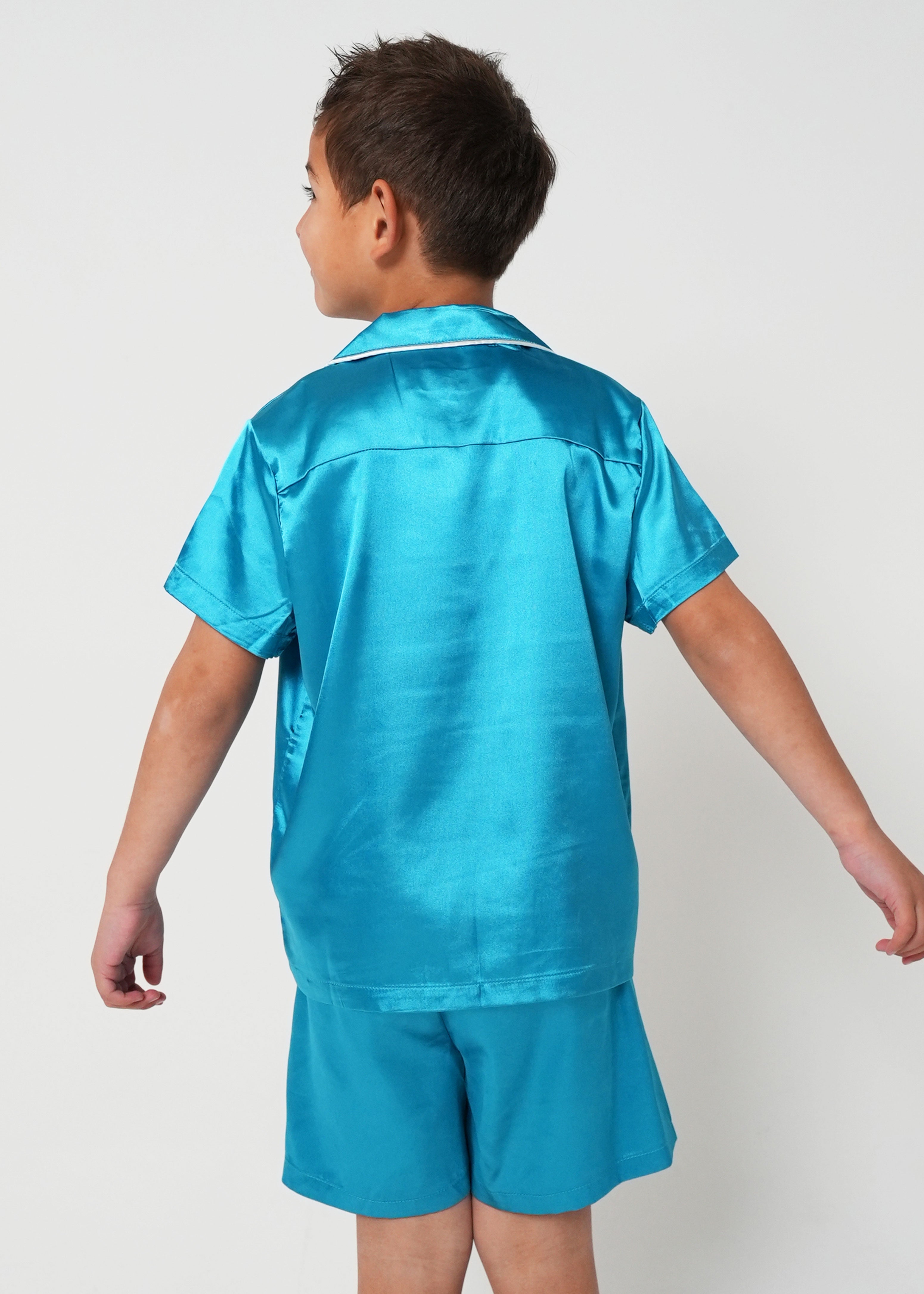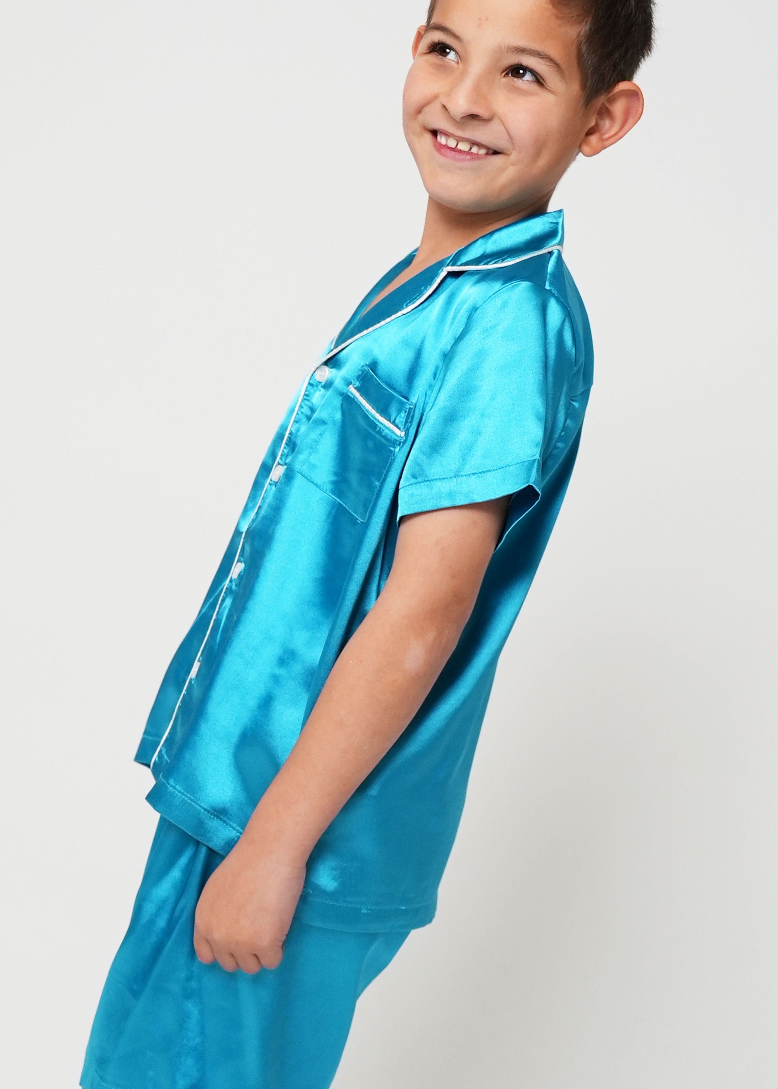 Elevate your sleep game instantly with our cosy Turquoise Satin Pyjamas. Made with your comfort in mind, these tried and true staple pyjamas feature knee length shorts, buttery soft fabric and a stretchy waistband for the ultimate comfort experience.
