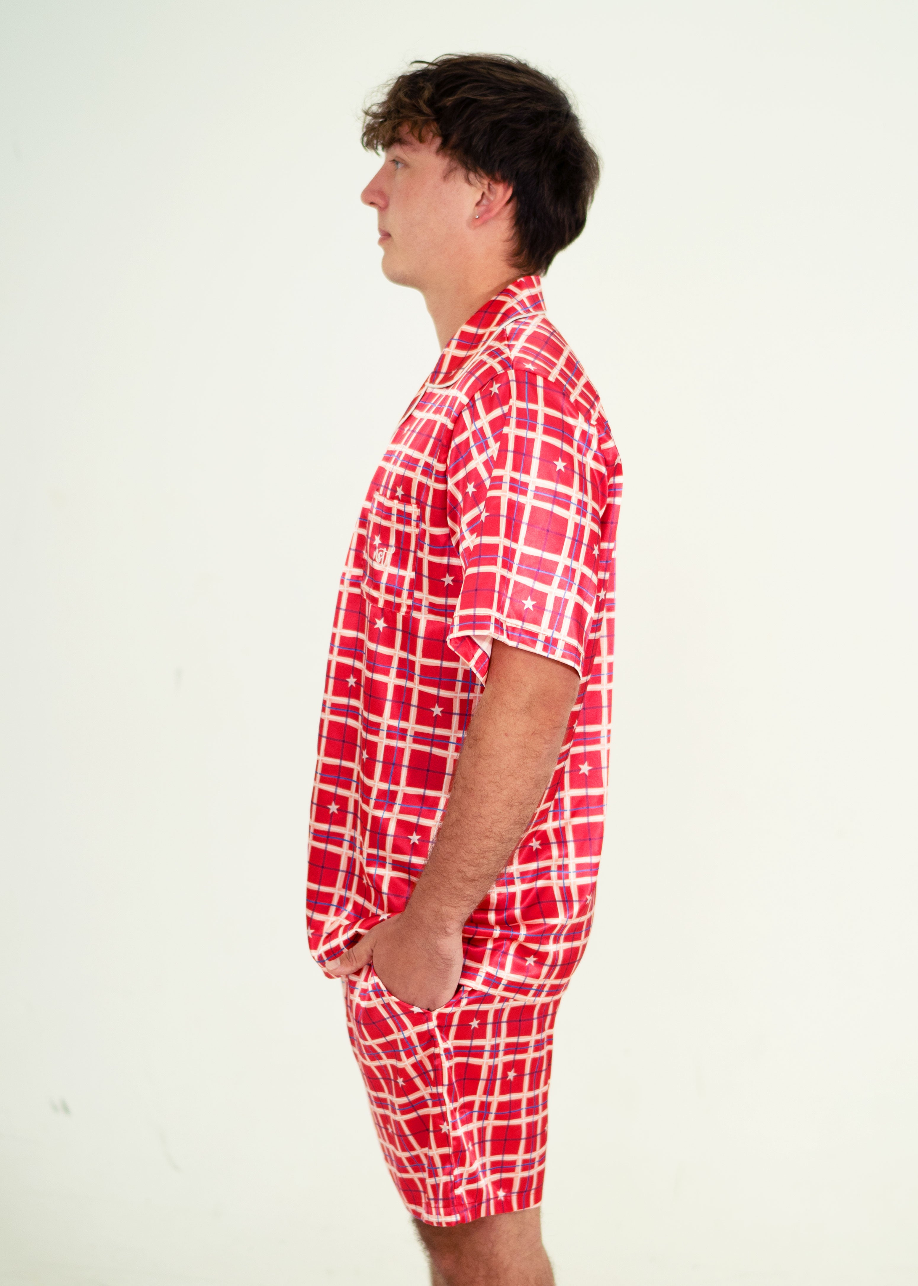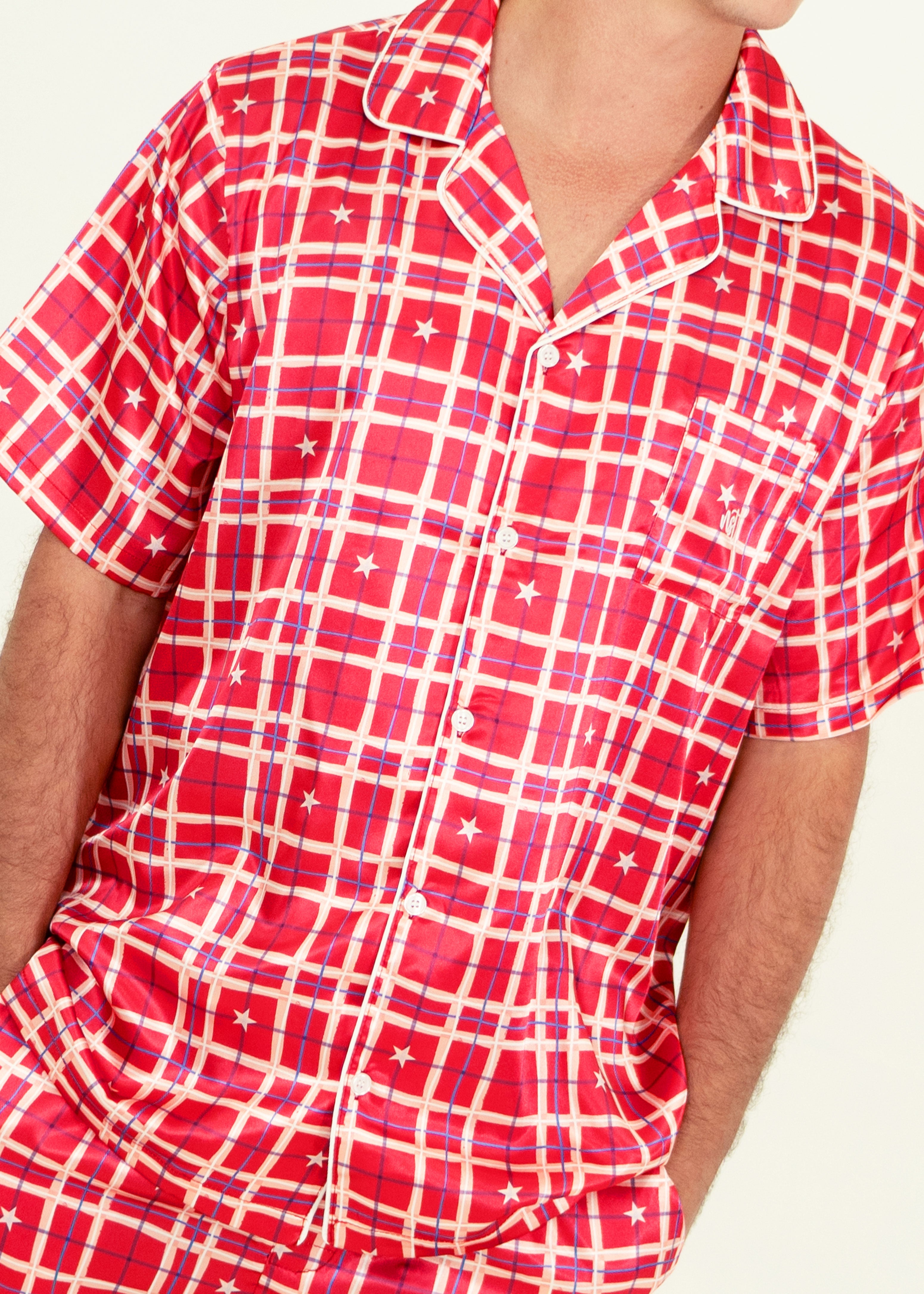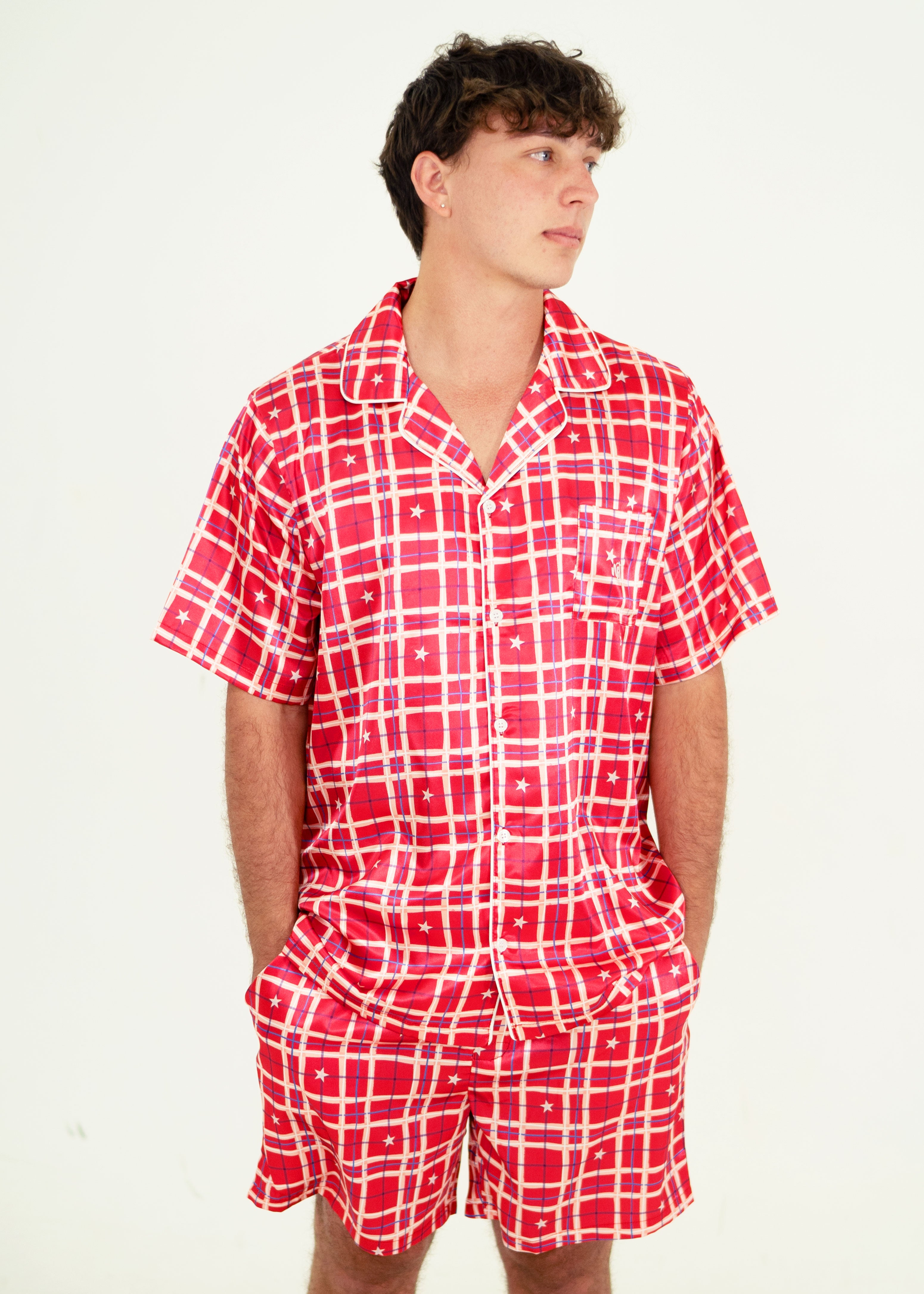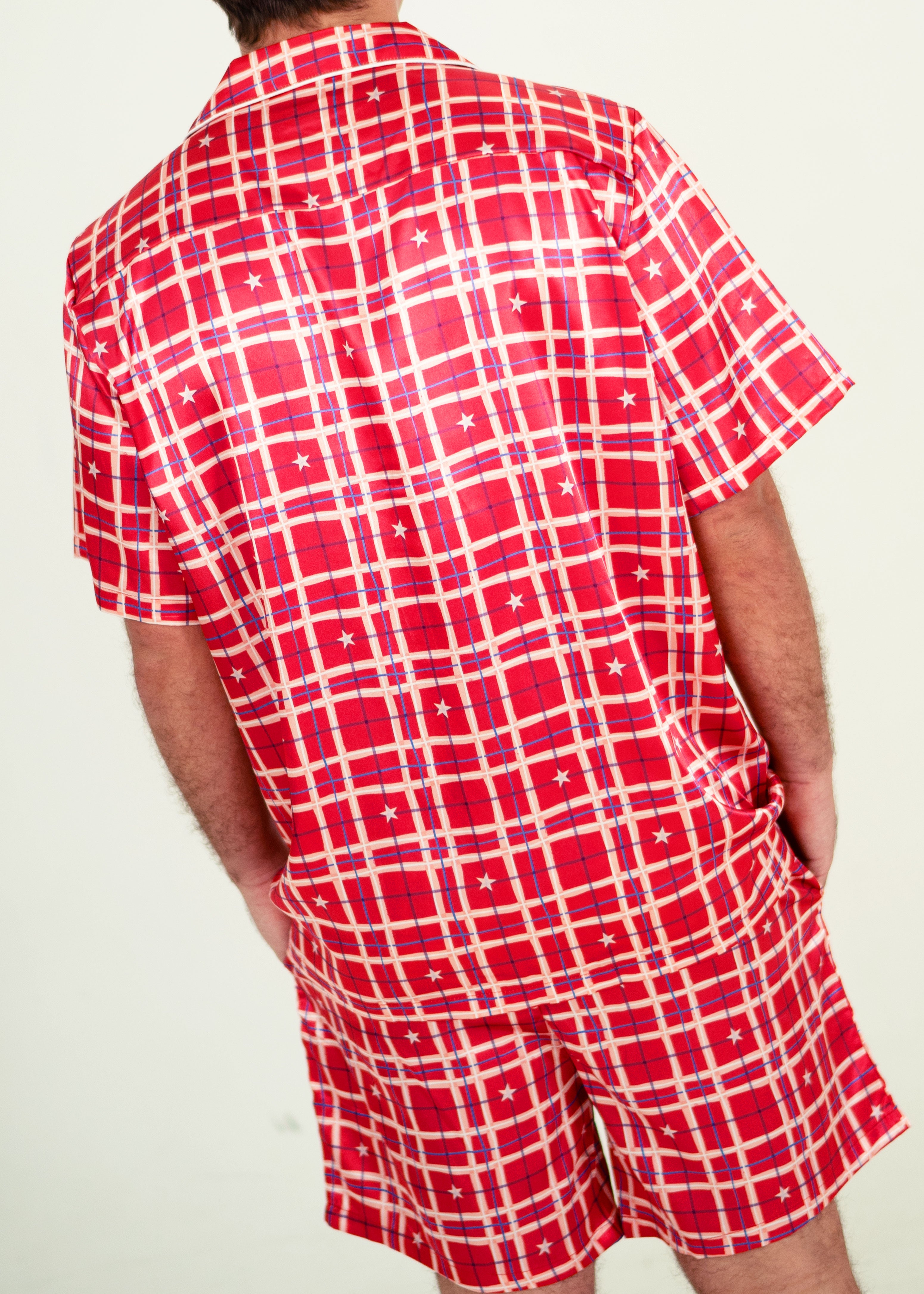 Mens Starry Tartan Red Satin Short Sleeve Pyjama Set
