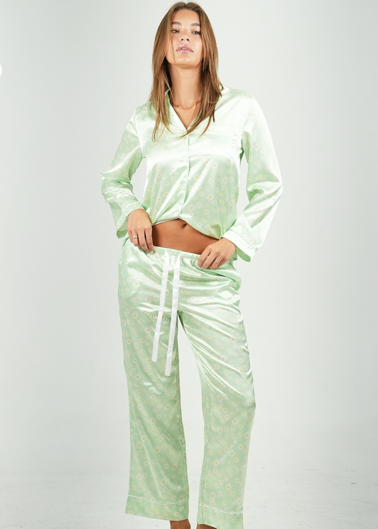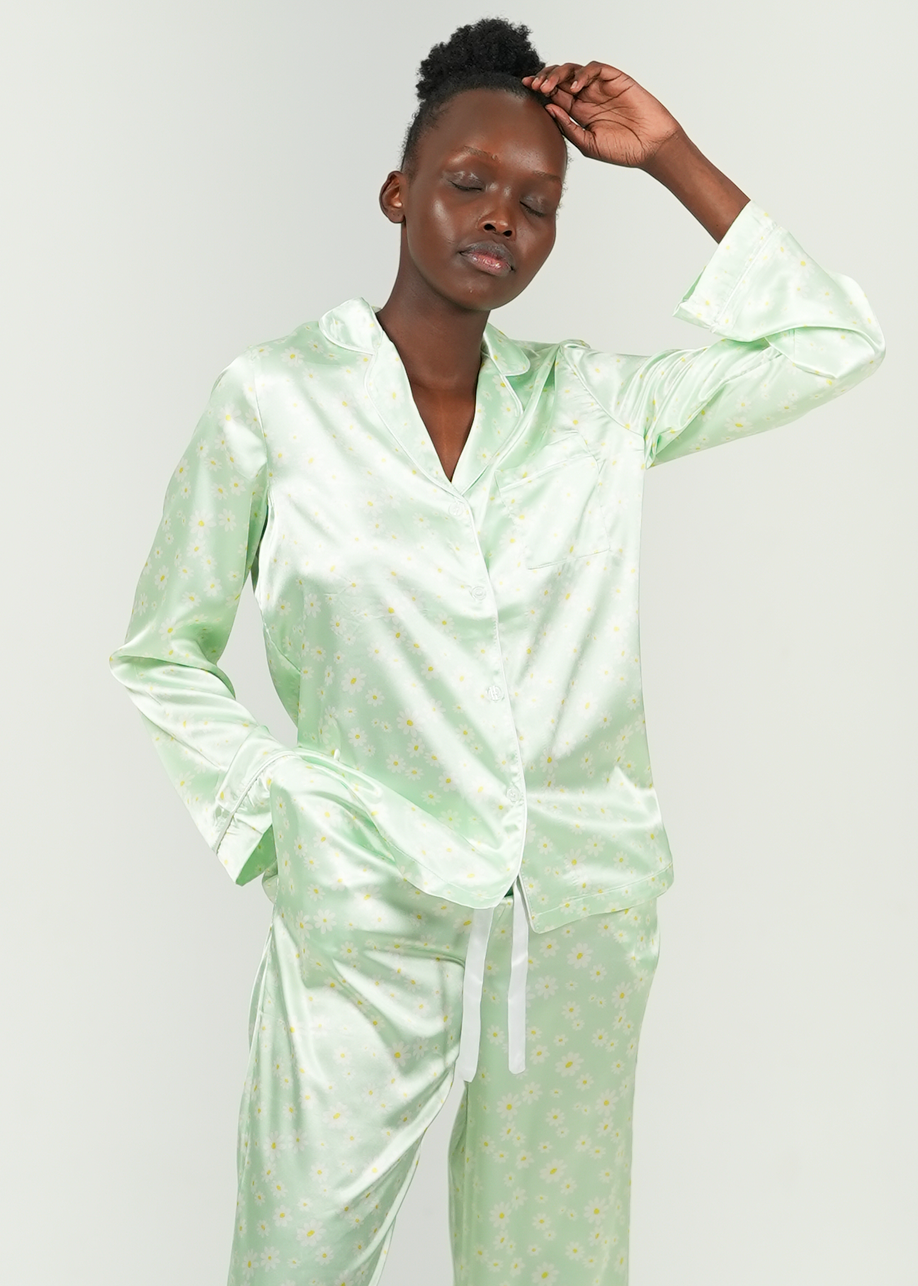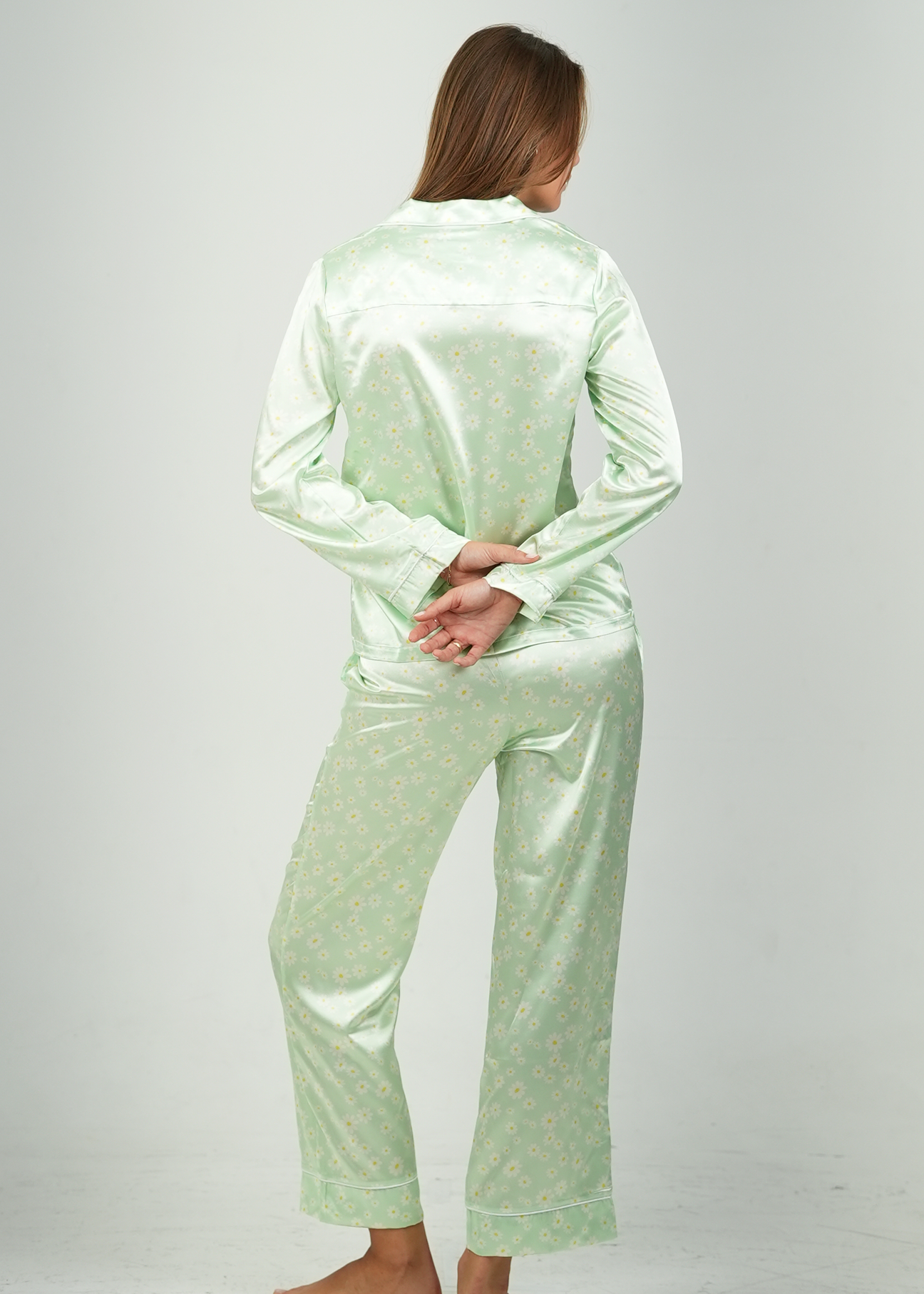 Frolic through the fields of endless daisies in our Green Daisy Long Top / Long Pants Satin Pyjamas. With deep pockets, adorable buttons, and an extra stretchy drawstring waistband for the ultimate comfort experience, you are sure to have the most luxurious sleep.