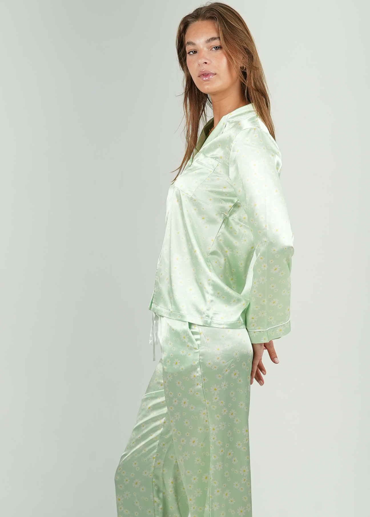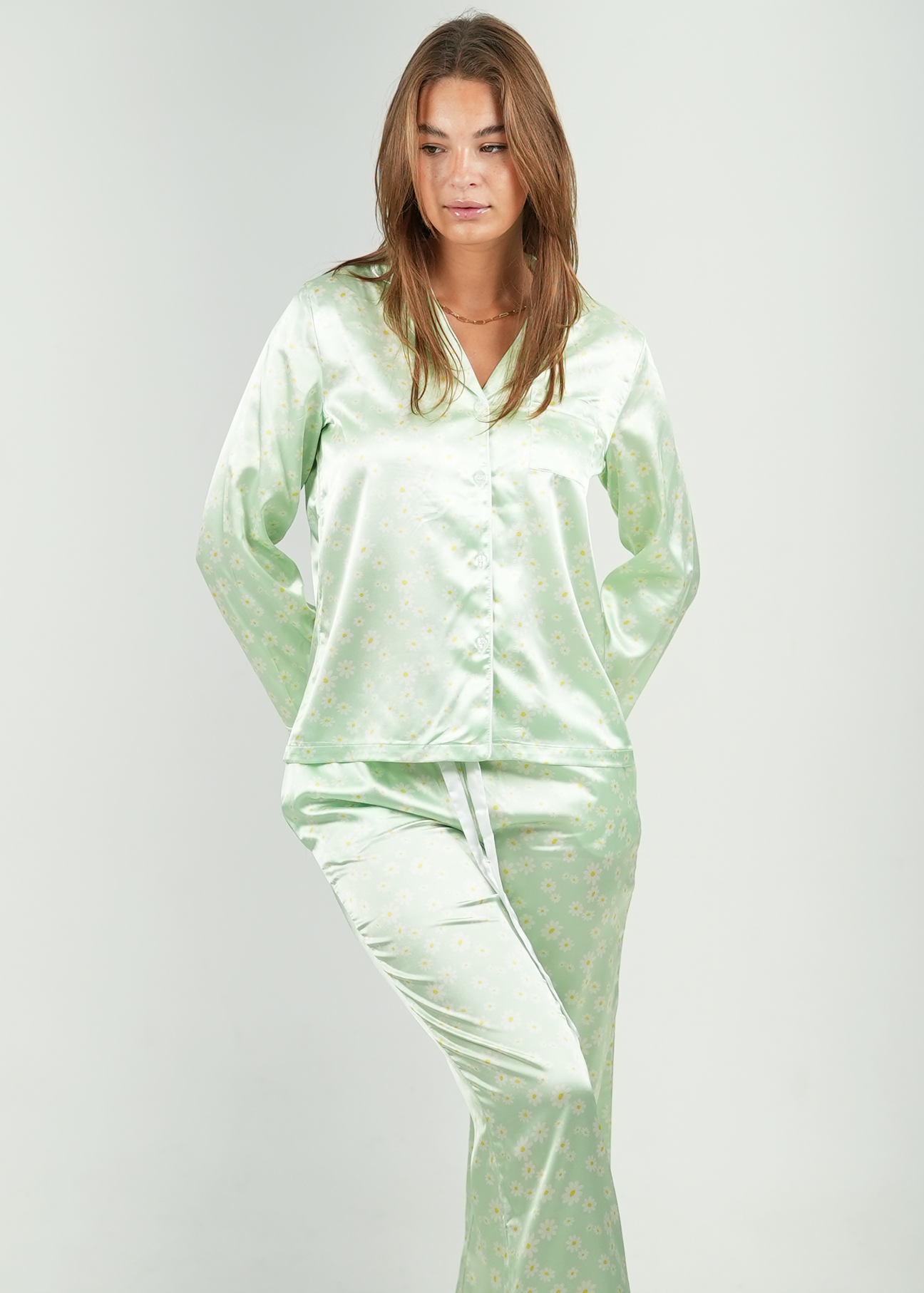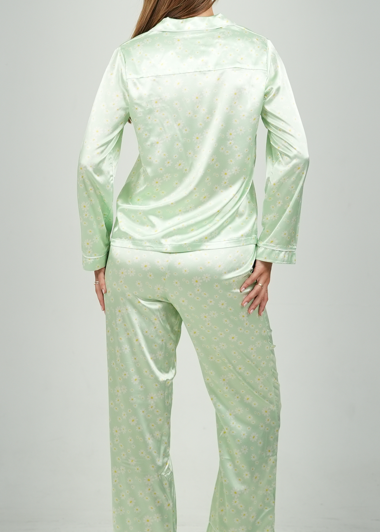 Frolic through the fields of endless daisies in our Green Daisy Long Top / Long Pants Satin Pyjamas. With deep pockets, adorable buttons, and an extra stretchy drawstring waistband for the ultimate comfort experience, you are sure to have the most luxurious sleep.