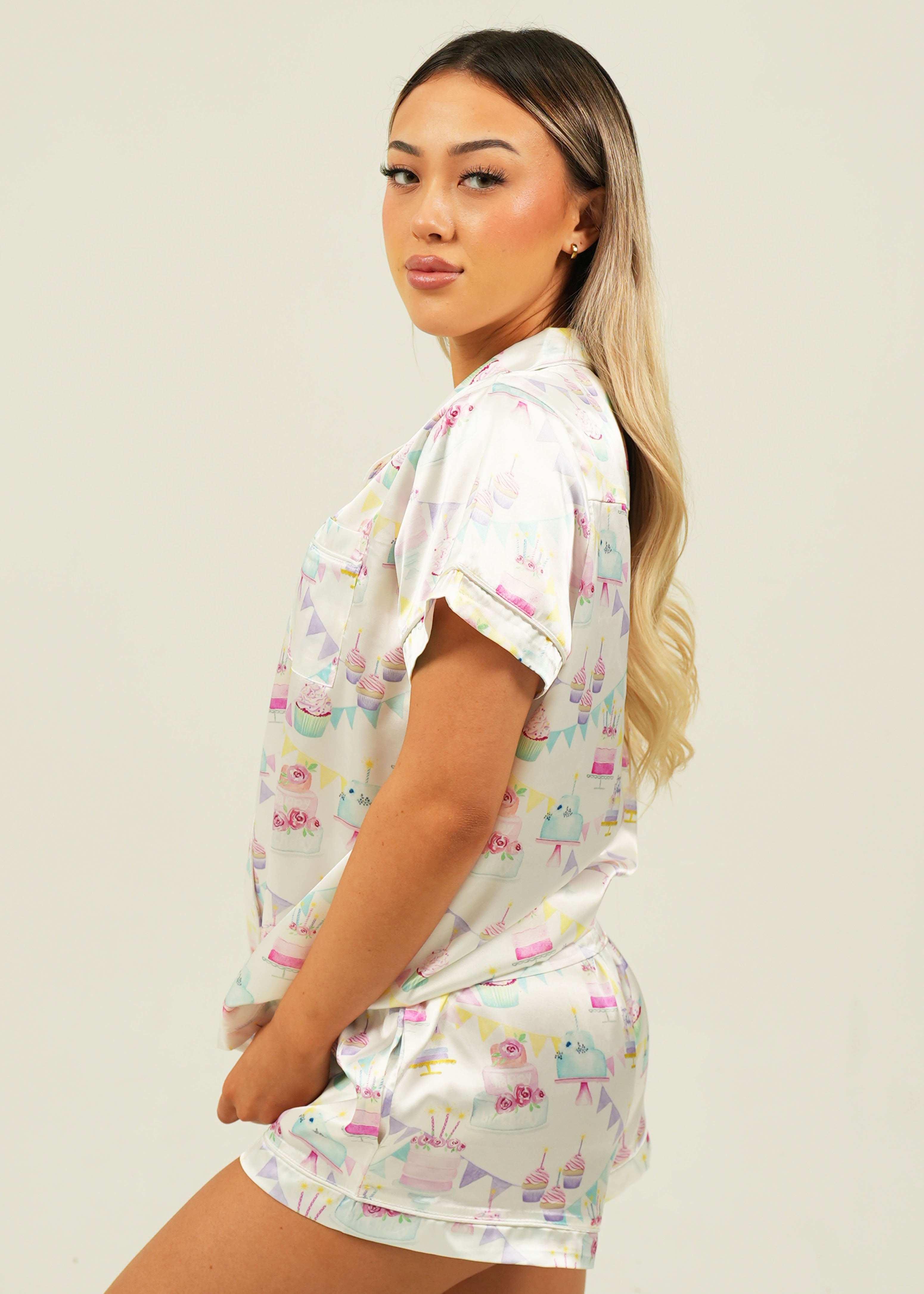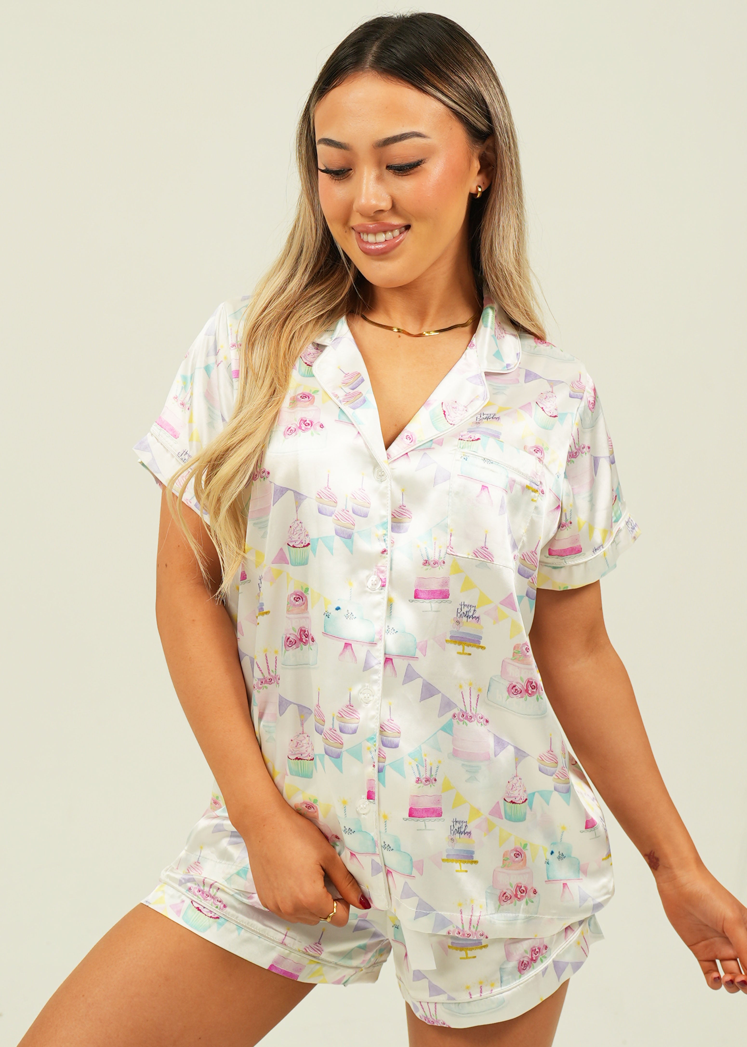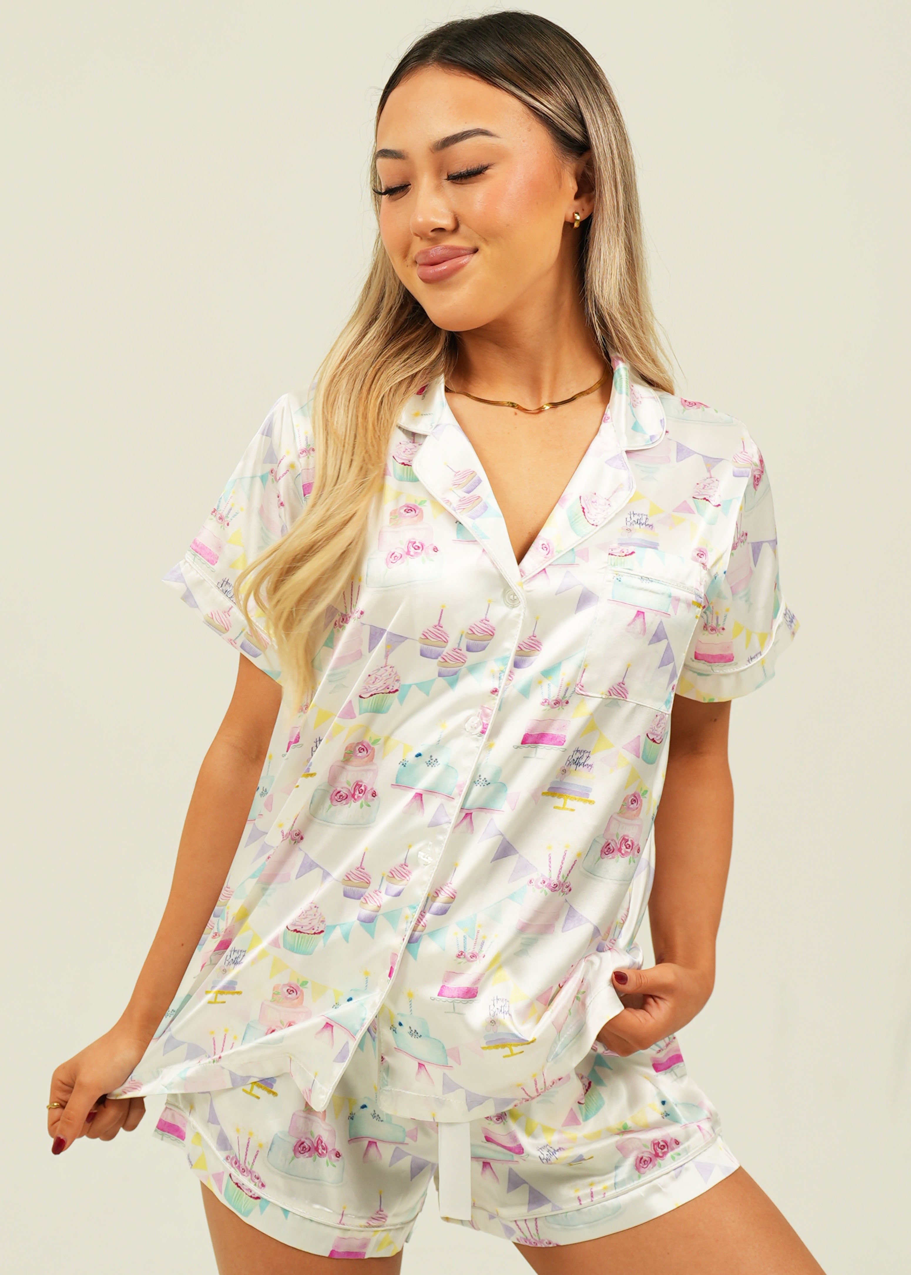 Celebrate in style with our festive Satin Birthday Pyjamas. Whether on your special day or just for fun, our Birthday set will make every moment a little brighter. Lovingly detailed with deep pockets, adorable buttons, and an extra stretchy drawstring waistband for the ultimate comfort experience.