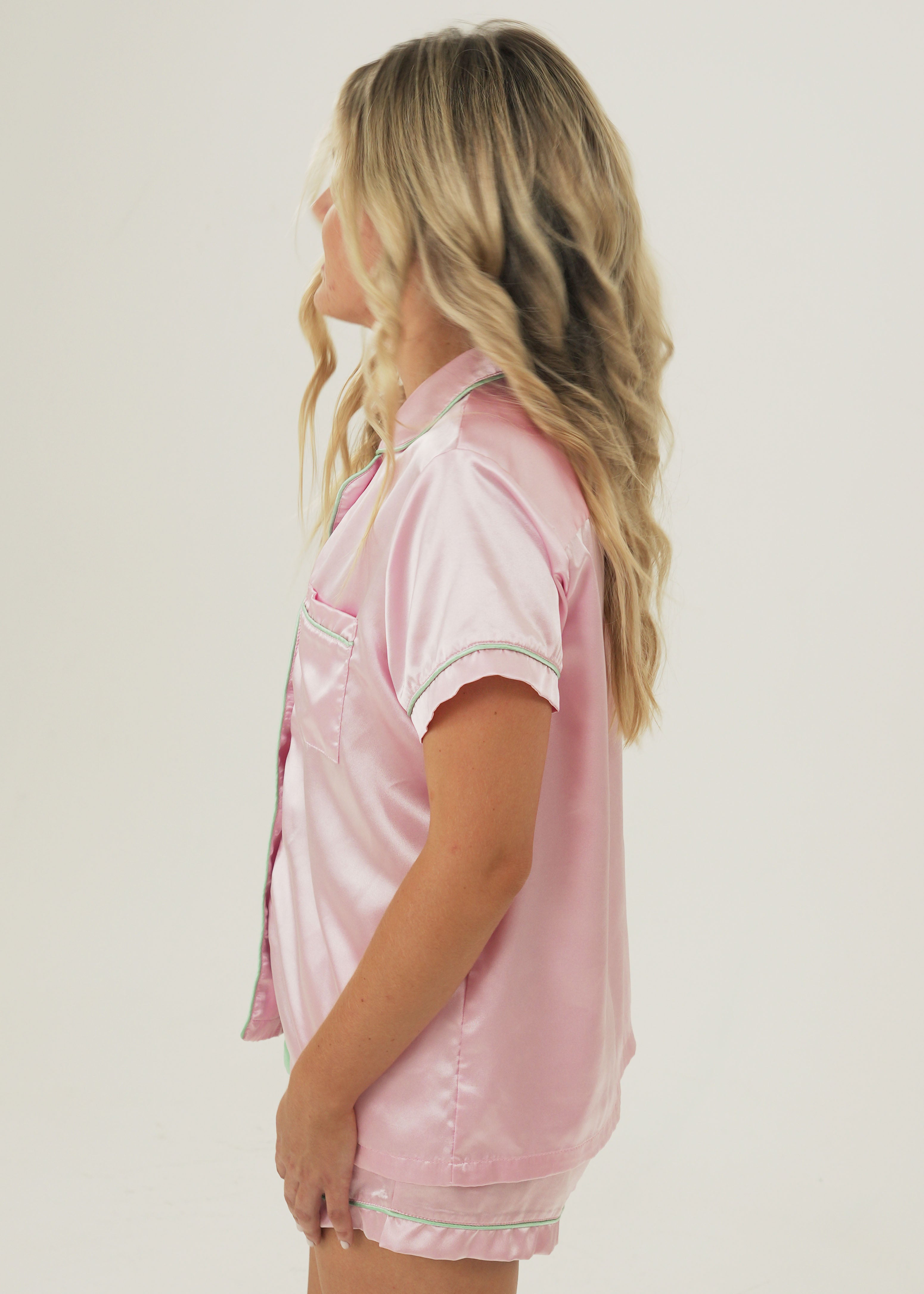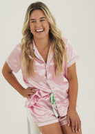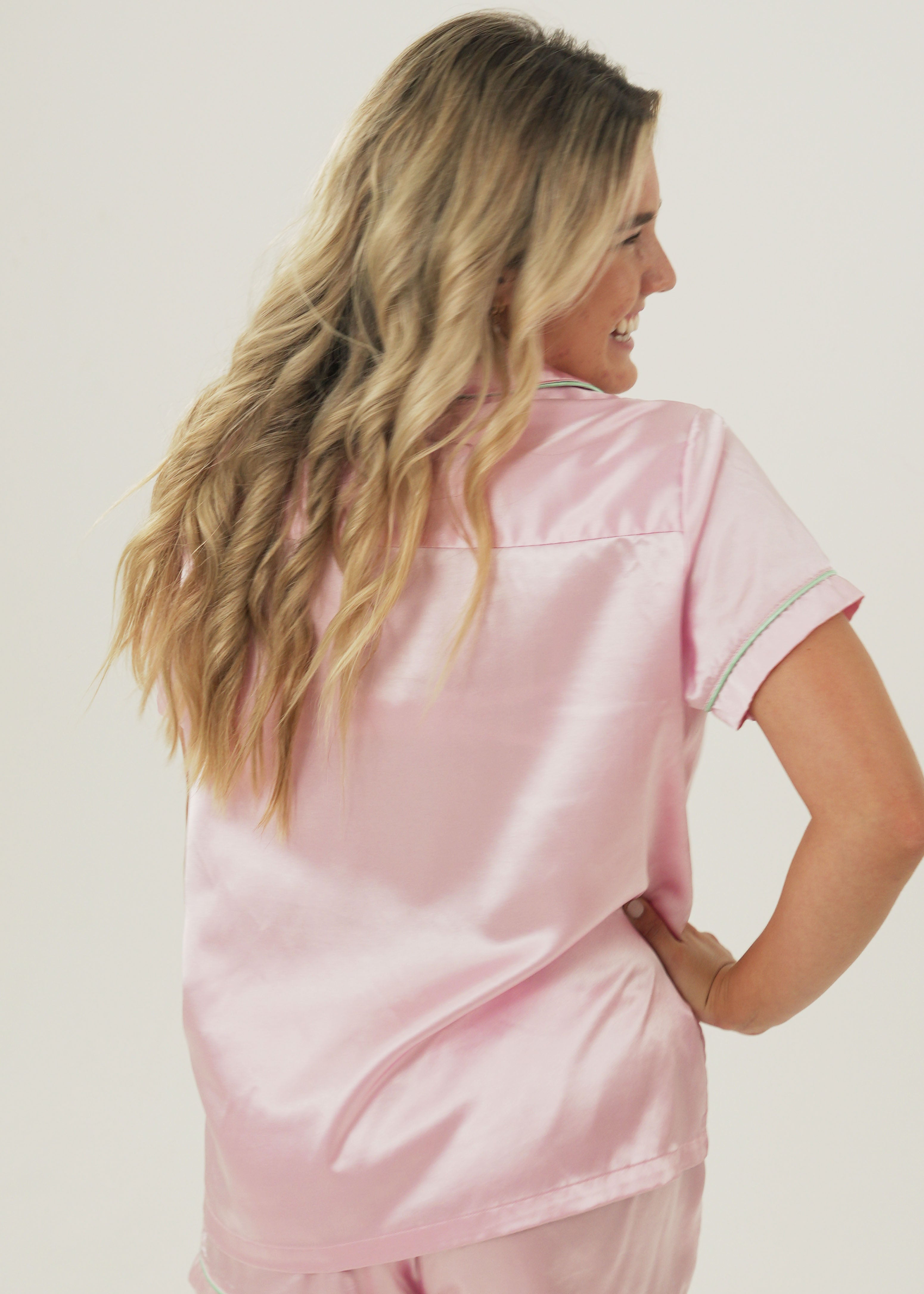 Indulge yourself in our luxuriously silky and oh so buttery soft Blush Pink Satin Pyjamas. Lovingly detailed with deep pockets, adorable buttons, and an extra stretchy drawstring waistband for the ultimate comfort experience.