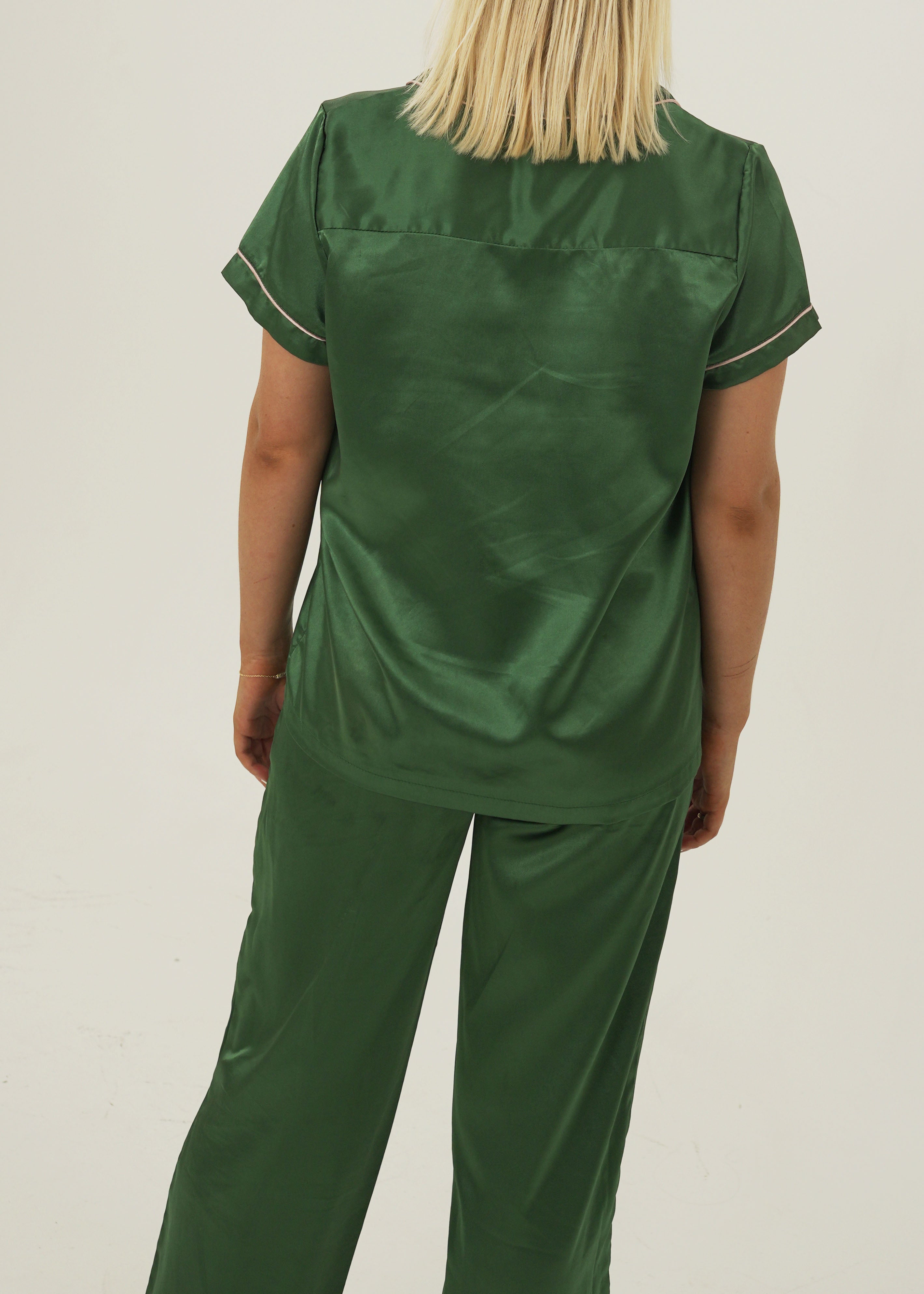 Indulge yourself in our luxuriously silky and oh so buttery soft Forest Green Satin Pyjamas. Lovingly detailed with deep pockets, adorable buttons, and an extra stretchy drawstring waistband for the ultimate comfort experience.