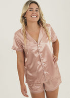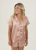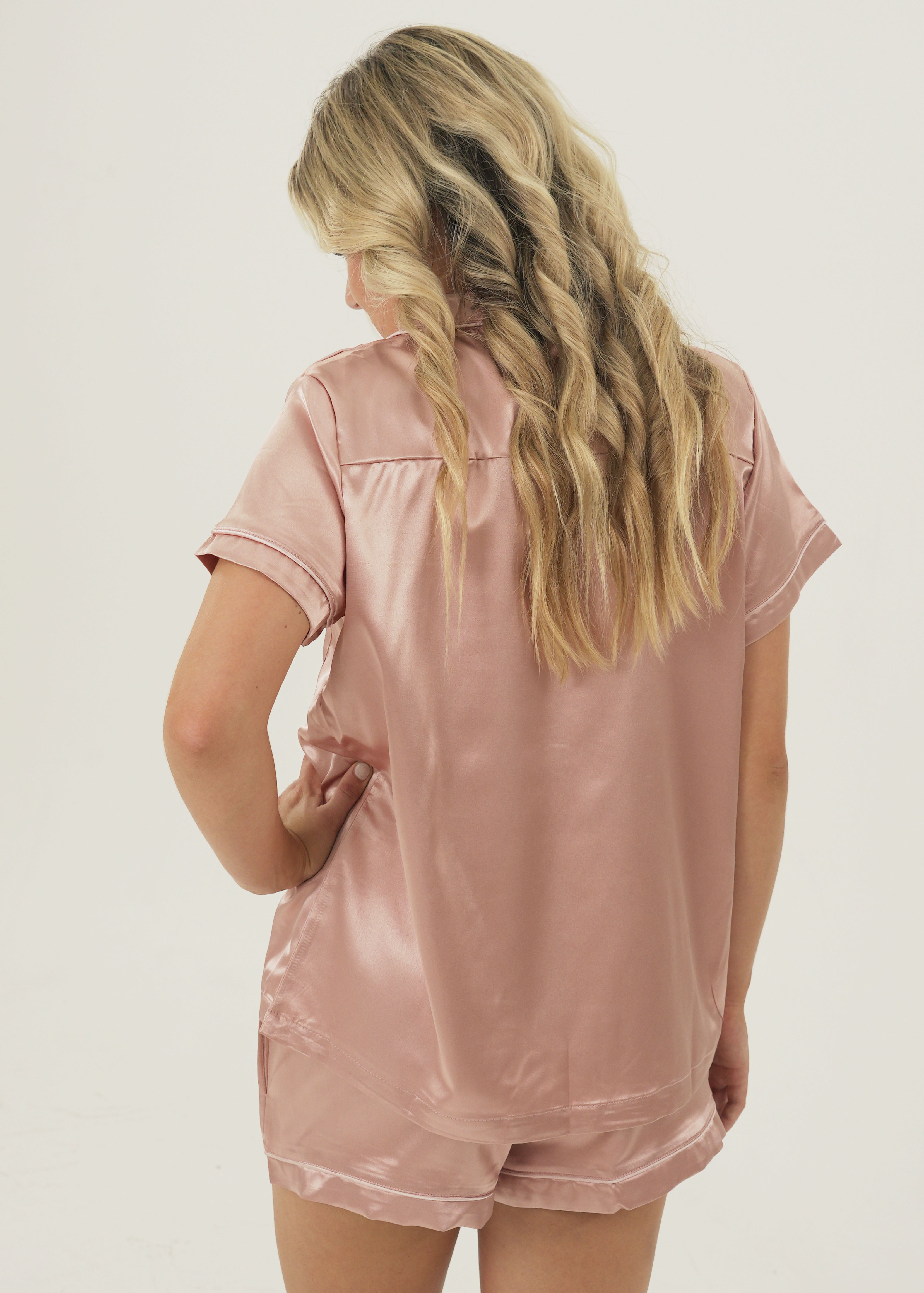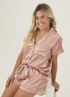 Indulge yourself in our luxuriously silky and oh so buttery soft Rose Pink Satin Pyjamas. Lovingly detailed with deep pockets, adorable buttons, and an extra stretchy drawstring waistband for the ultimate comfort experience.