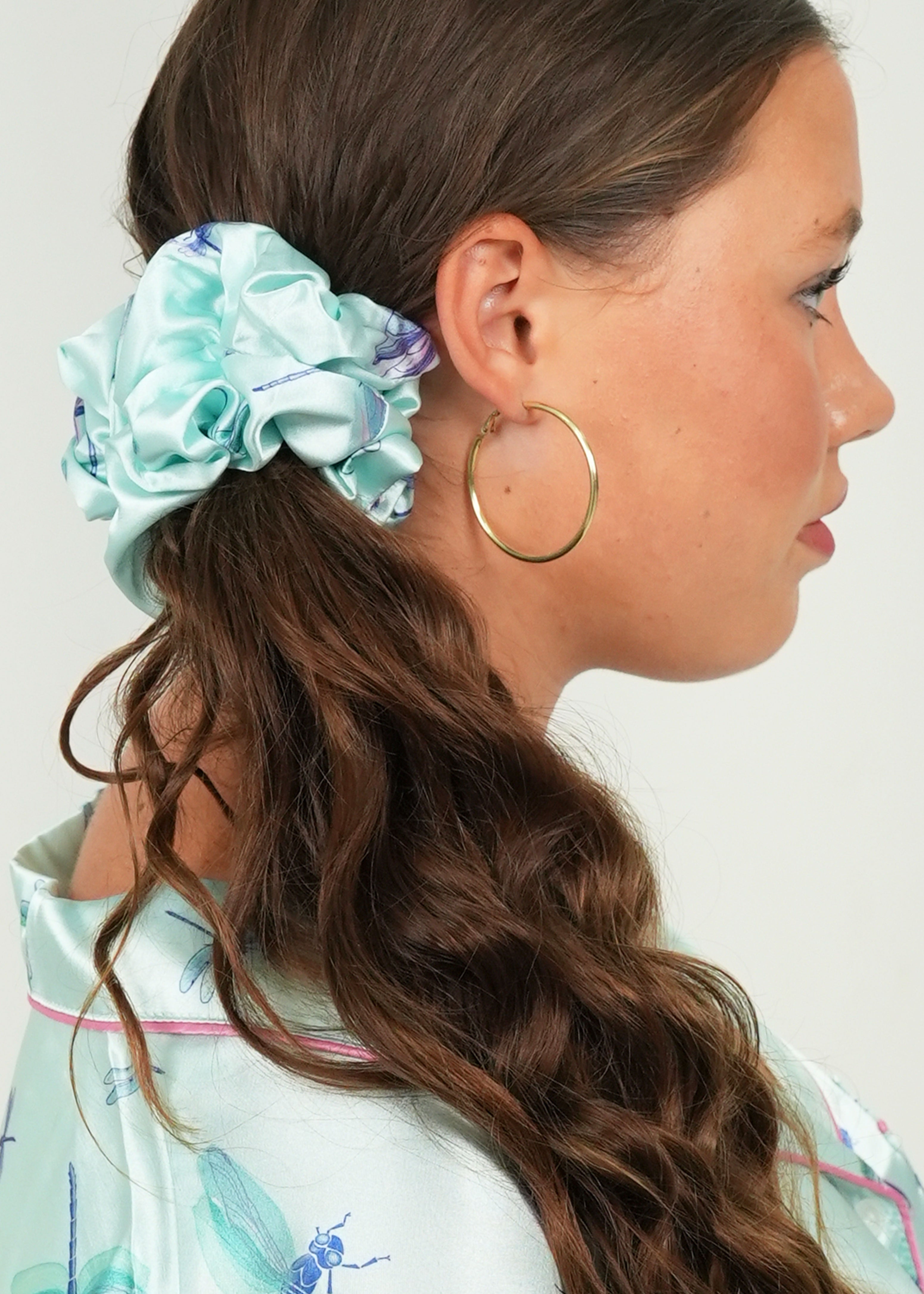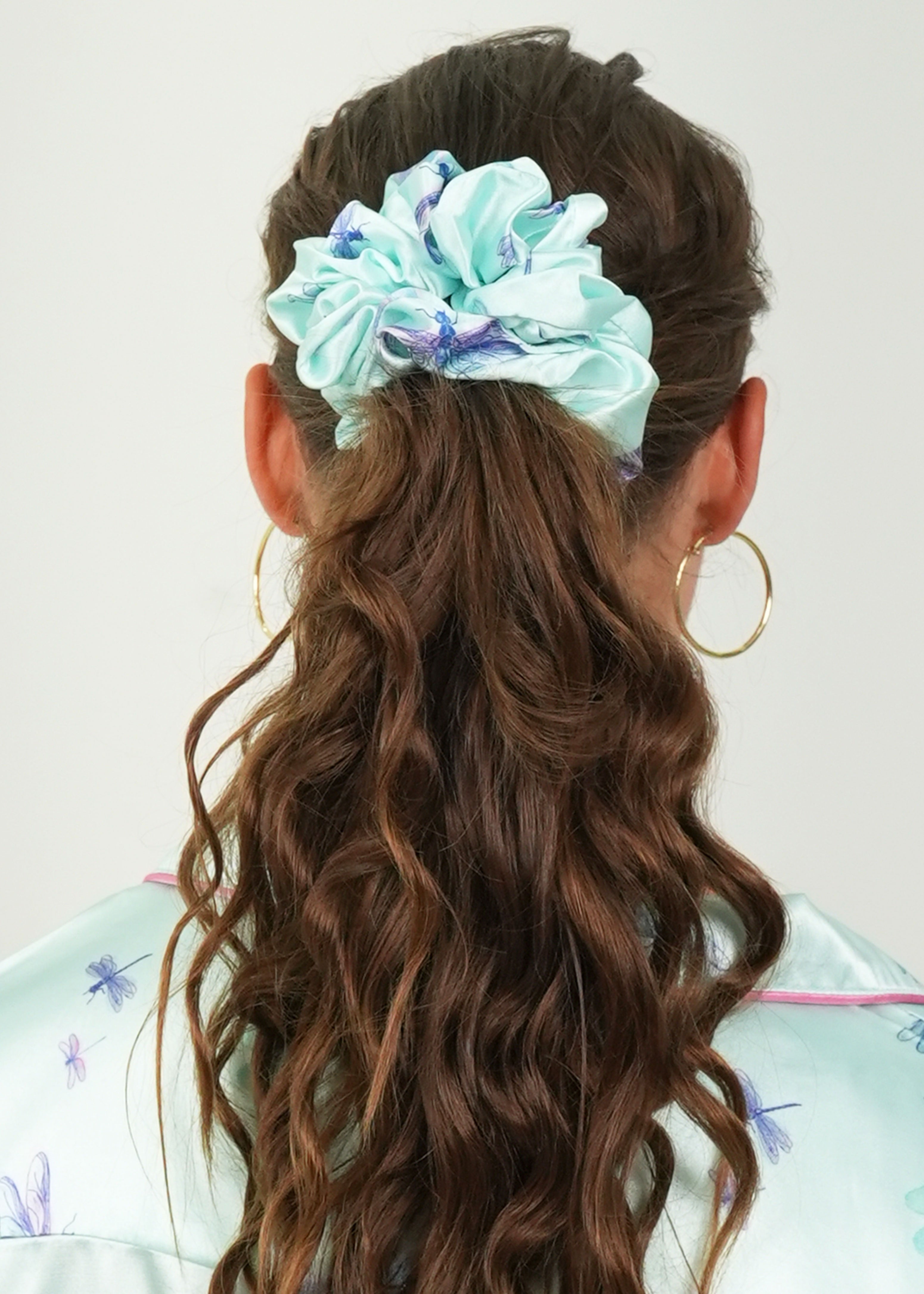 Add a playful touch to your bedtime routine with our stunning Aqua Dragonflies scrunchie, featuring a unique design to match your favourite set of Night Sweet Thing pyjamas! Made from soft, hair-friendly fabric, it securely holds your hair whilst adding a pop of colour and fun! Treat yourself or gift it to a friend - sweet dreams await!