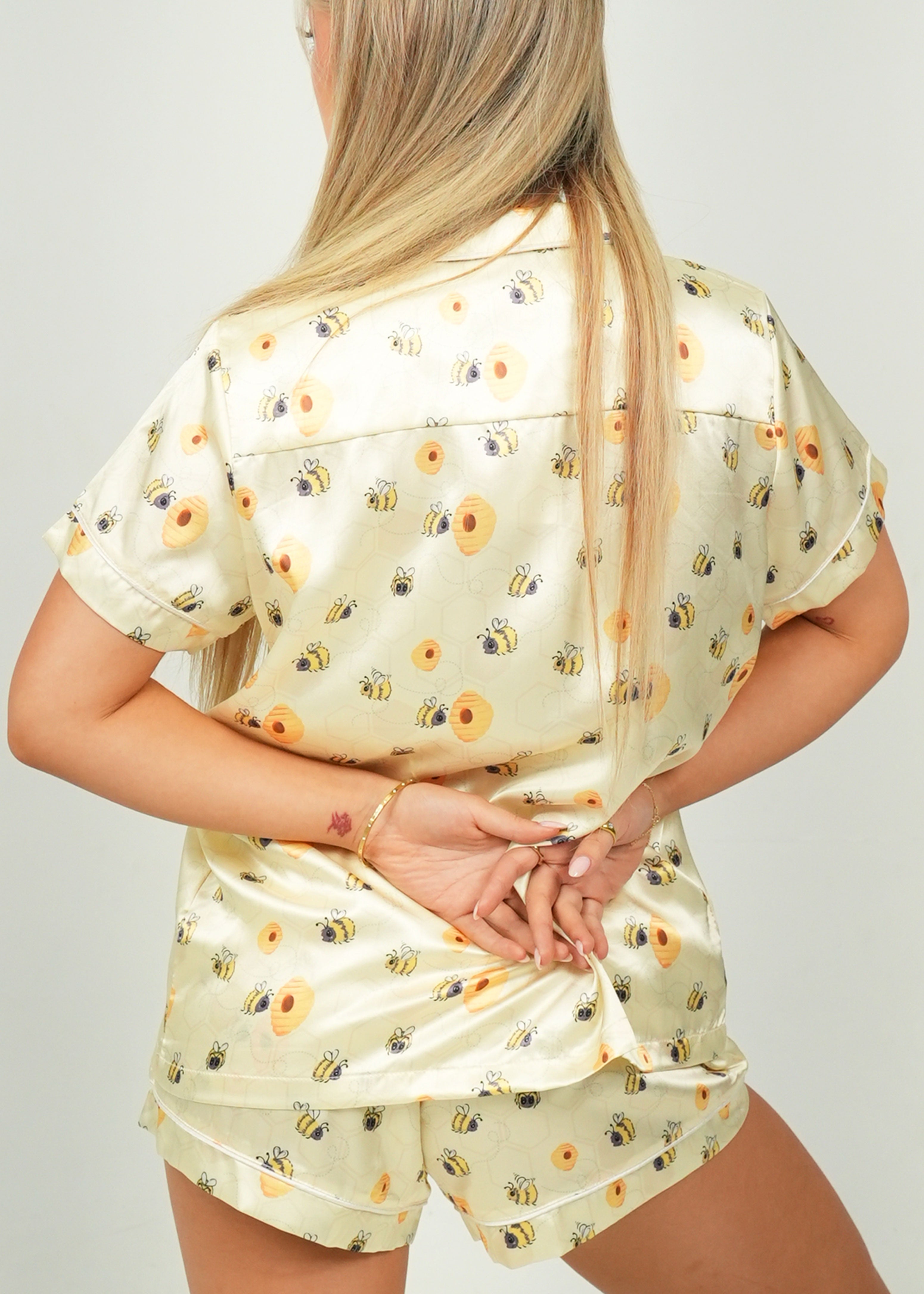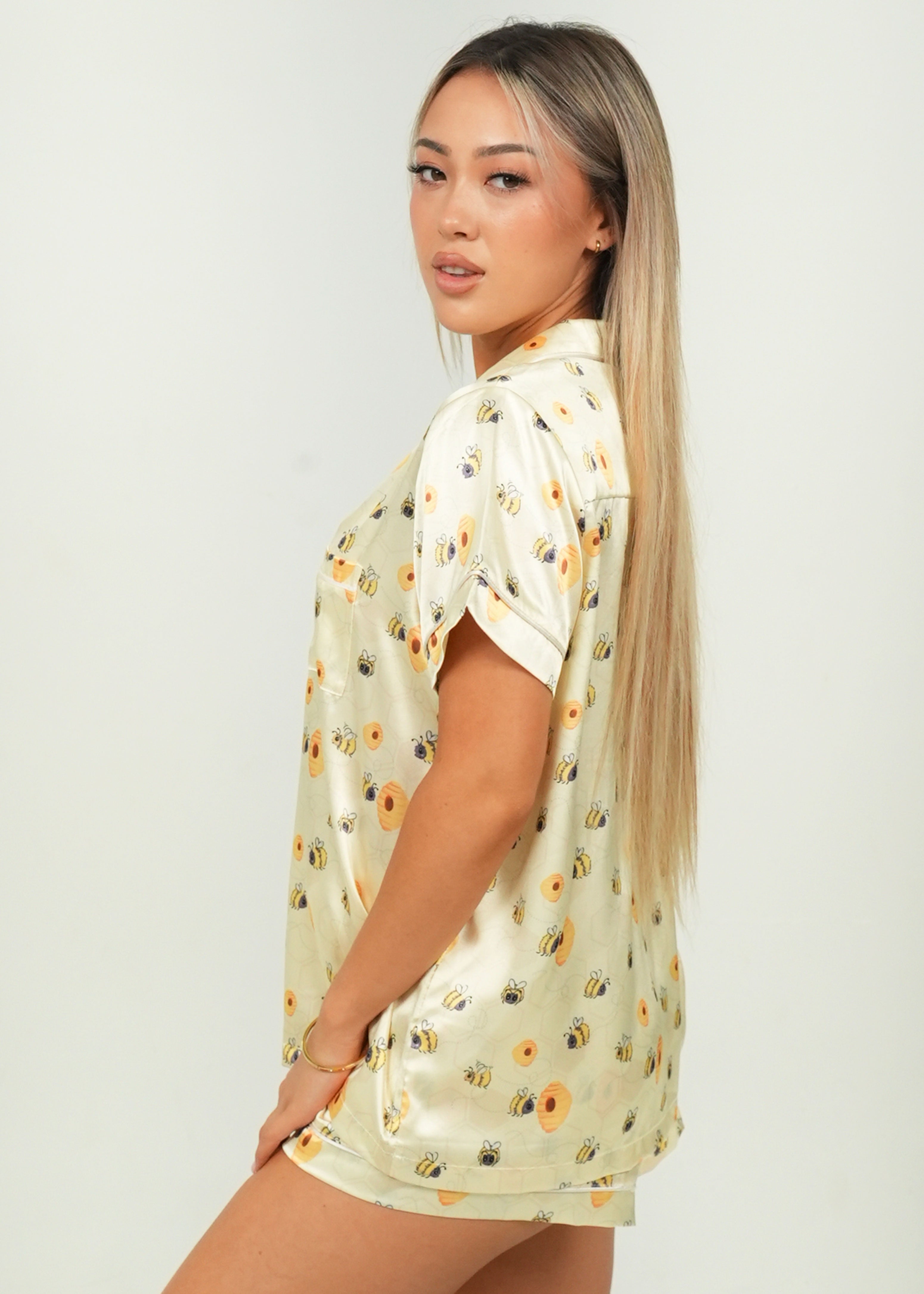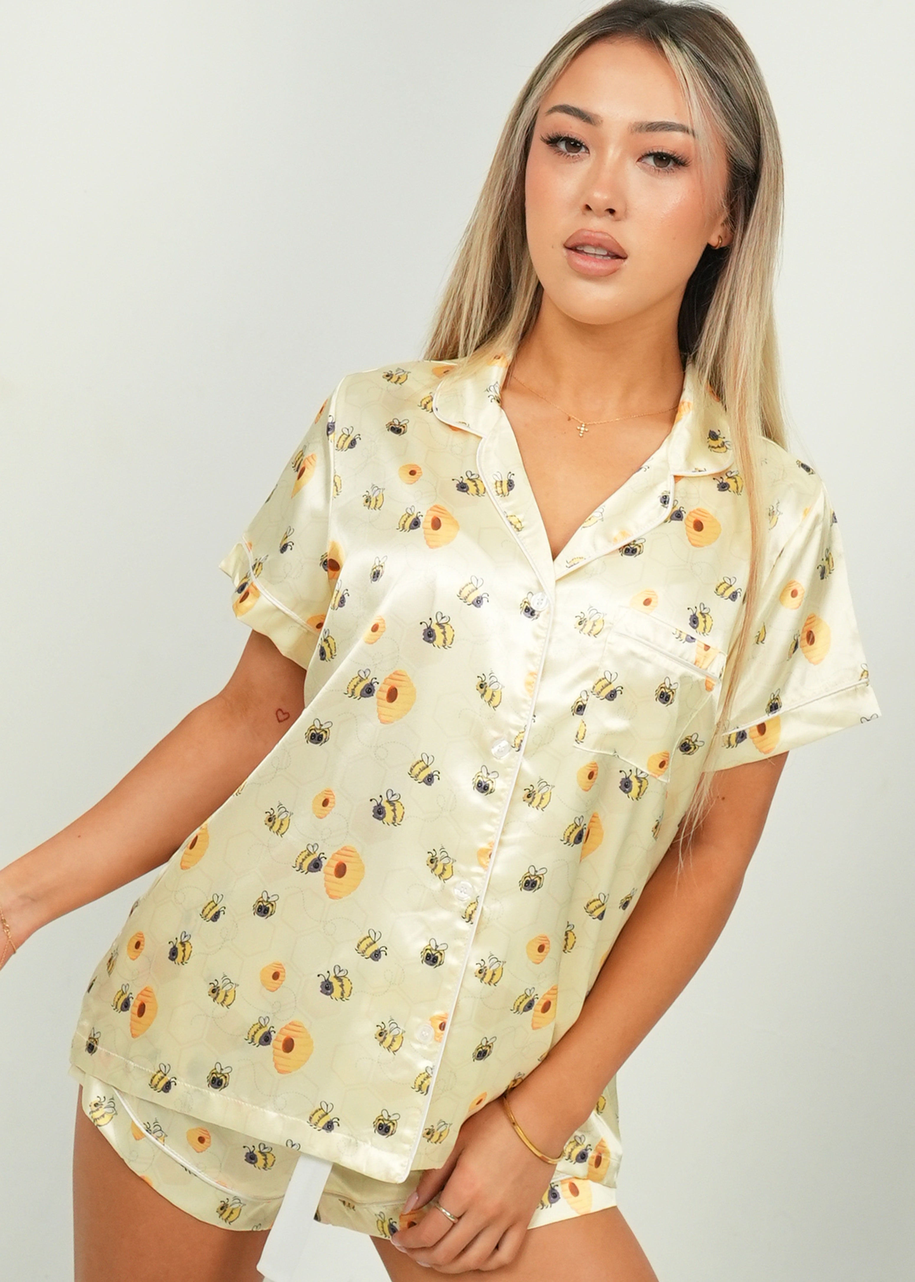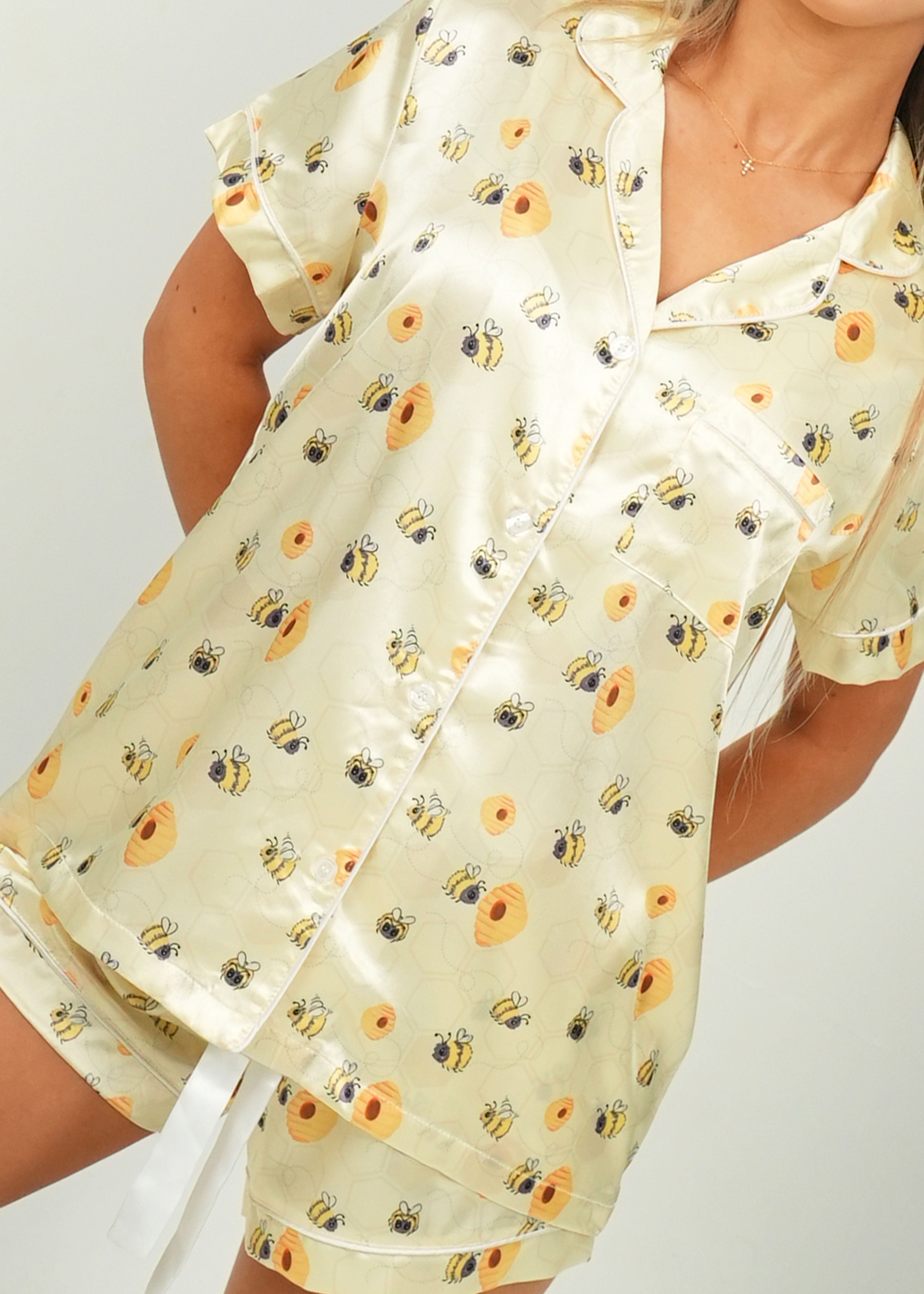 Add a touch of goodness to your bedtime with these gorgeous Yellow Bumble Bees Pyjamas. With deep pockets, adorable buttons, and an extra stretchy drawstring waistband for the ultimate comfort experience, you are sure to have the most tranquil sleep.