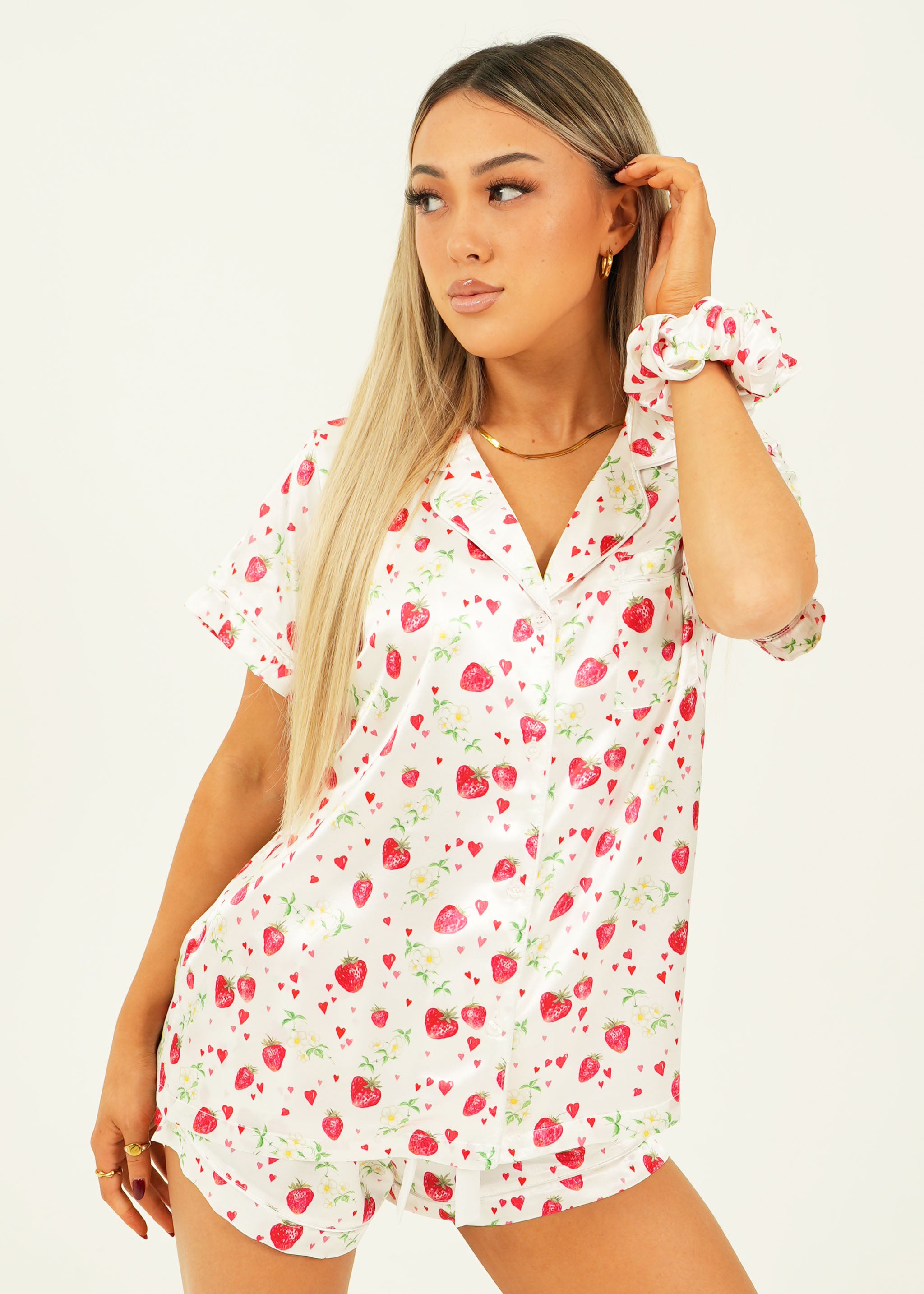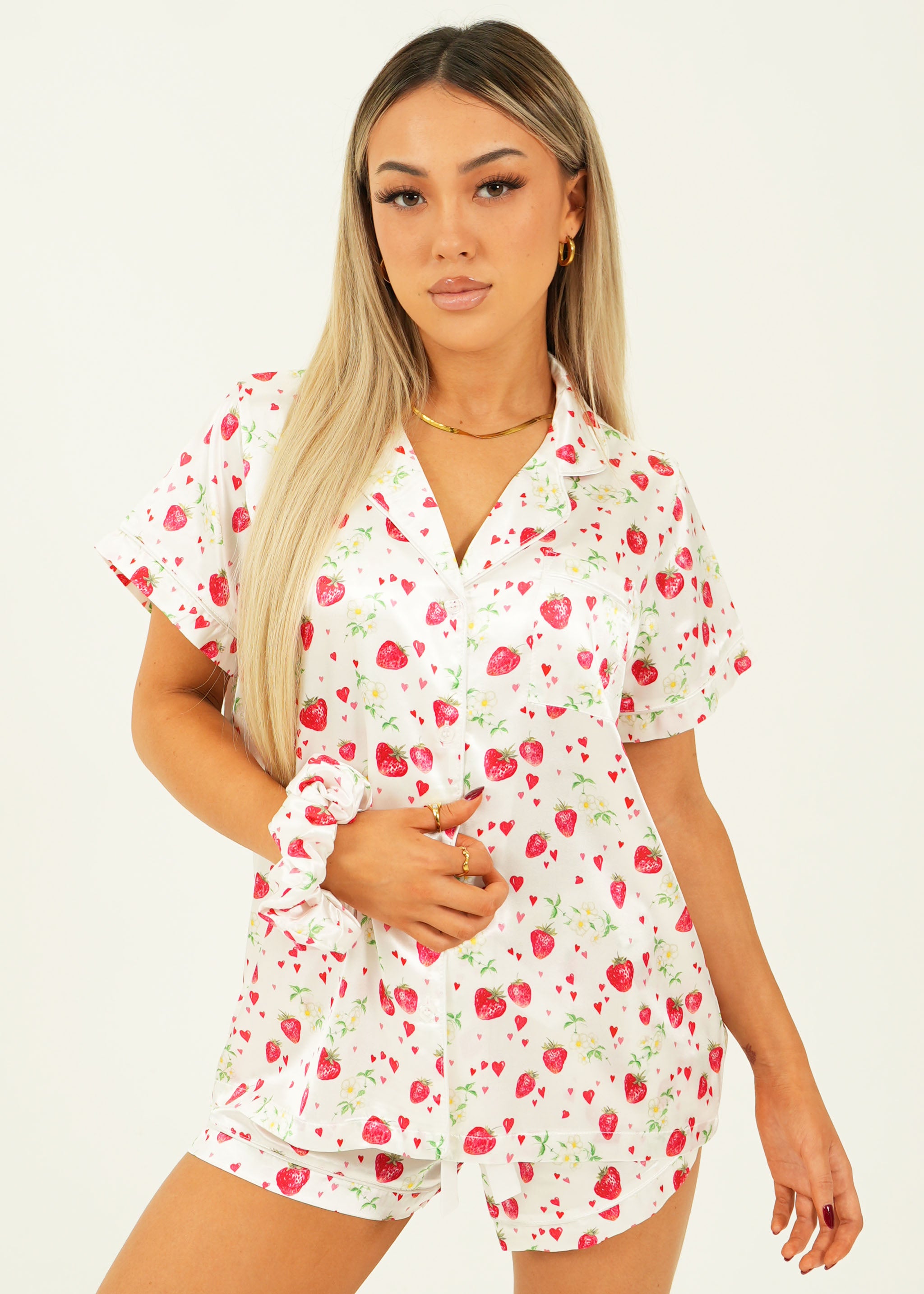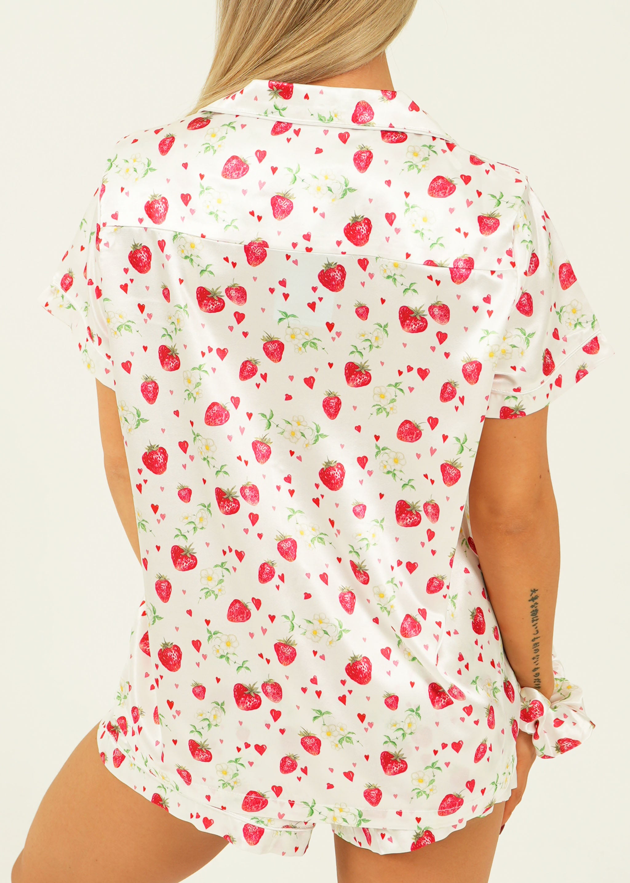 Add a touch of fruity goodness to your bedtime with our gorgeous Strawberries Satin Pyjamas. Beautifully detailed with deep pockets, adorable buttons, and an extra stretchy drawstring waistband, you are sure to have a peachy keen sleep!