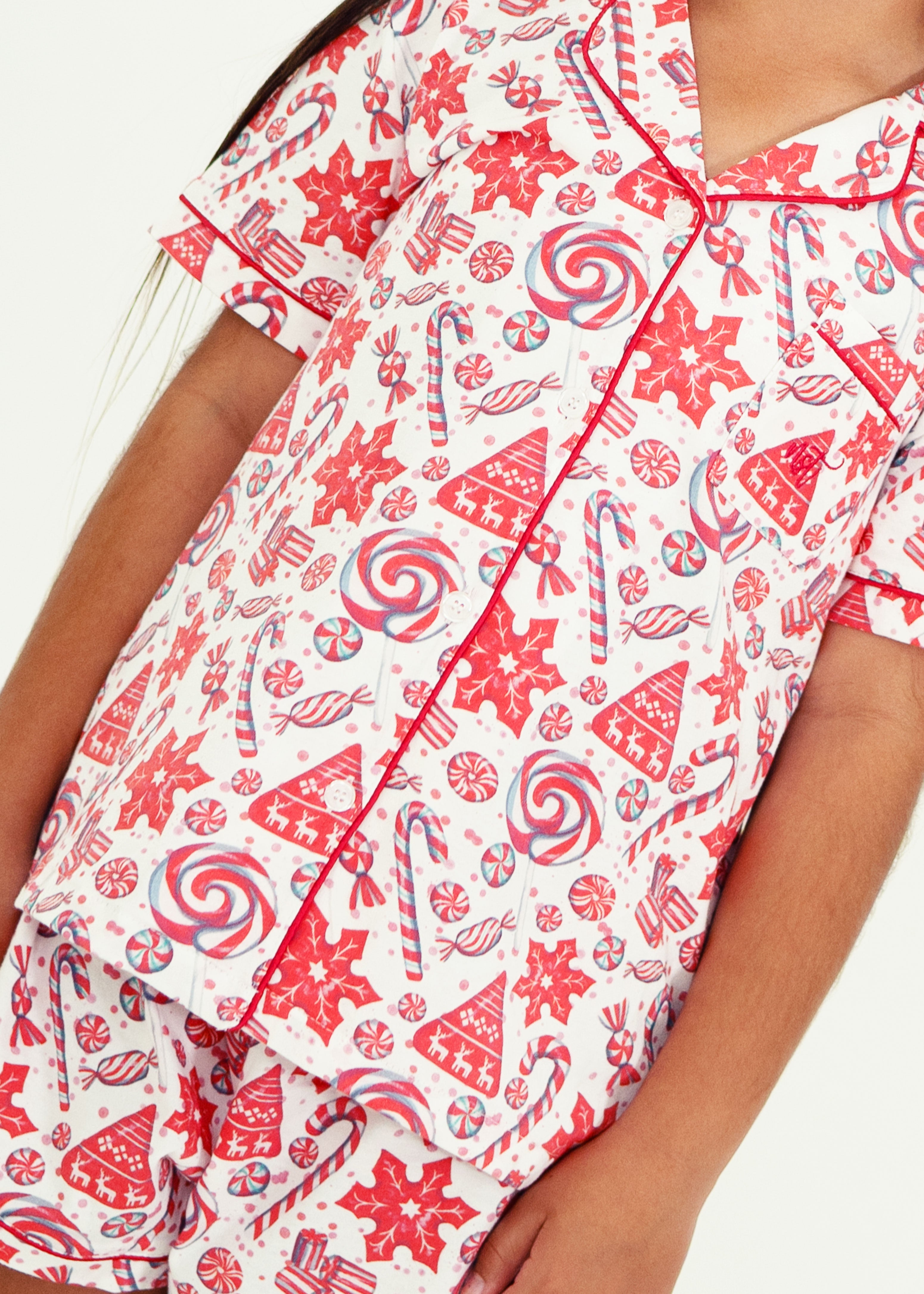Add a touch of Christmas nostalgia to your bedtime with these gorgeous Sweet Christmas White Jersey Knit Cotton Short Pjs. Featuring adorable buttons and an extra stretchy waistband for the ultimate sleep experience.