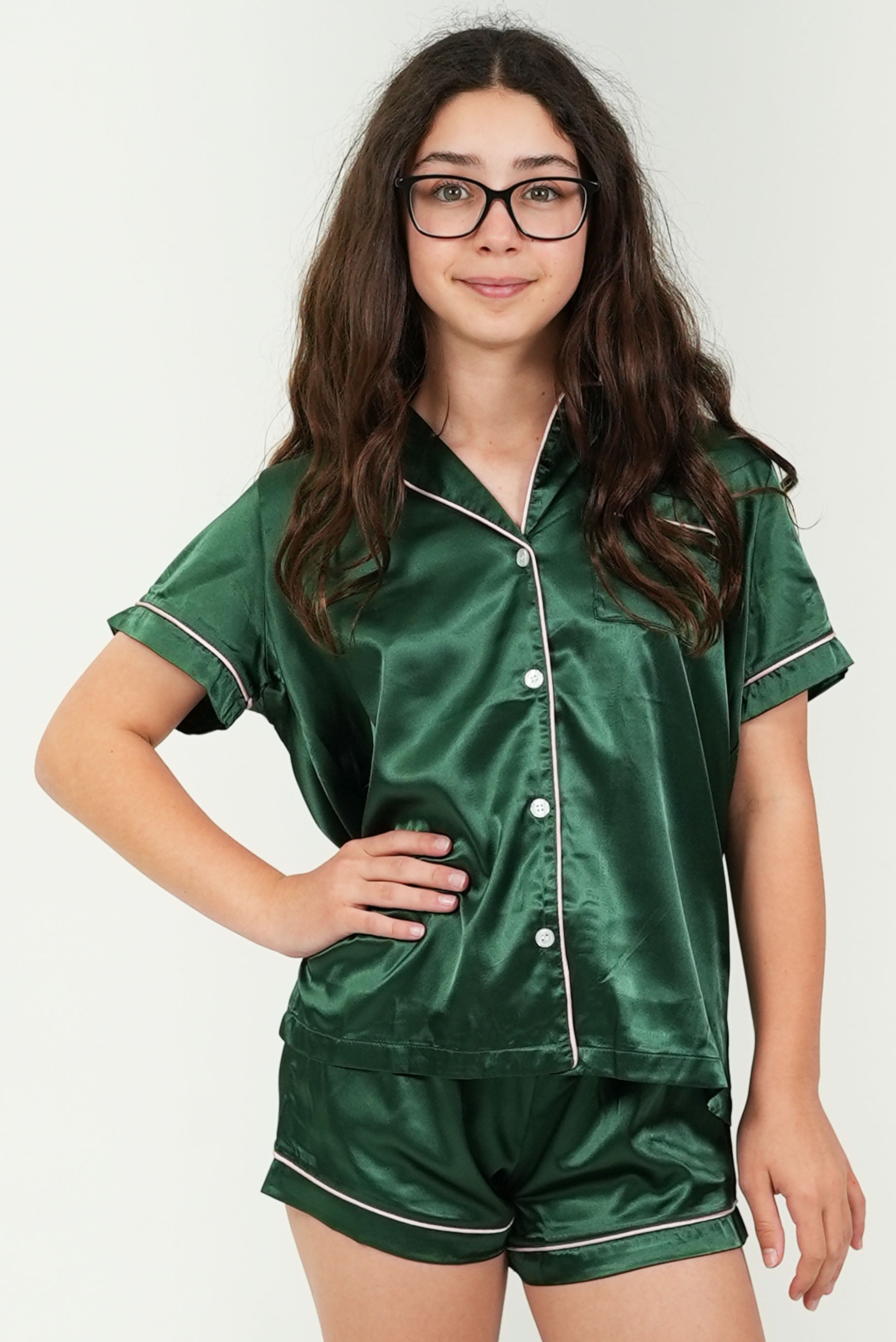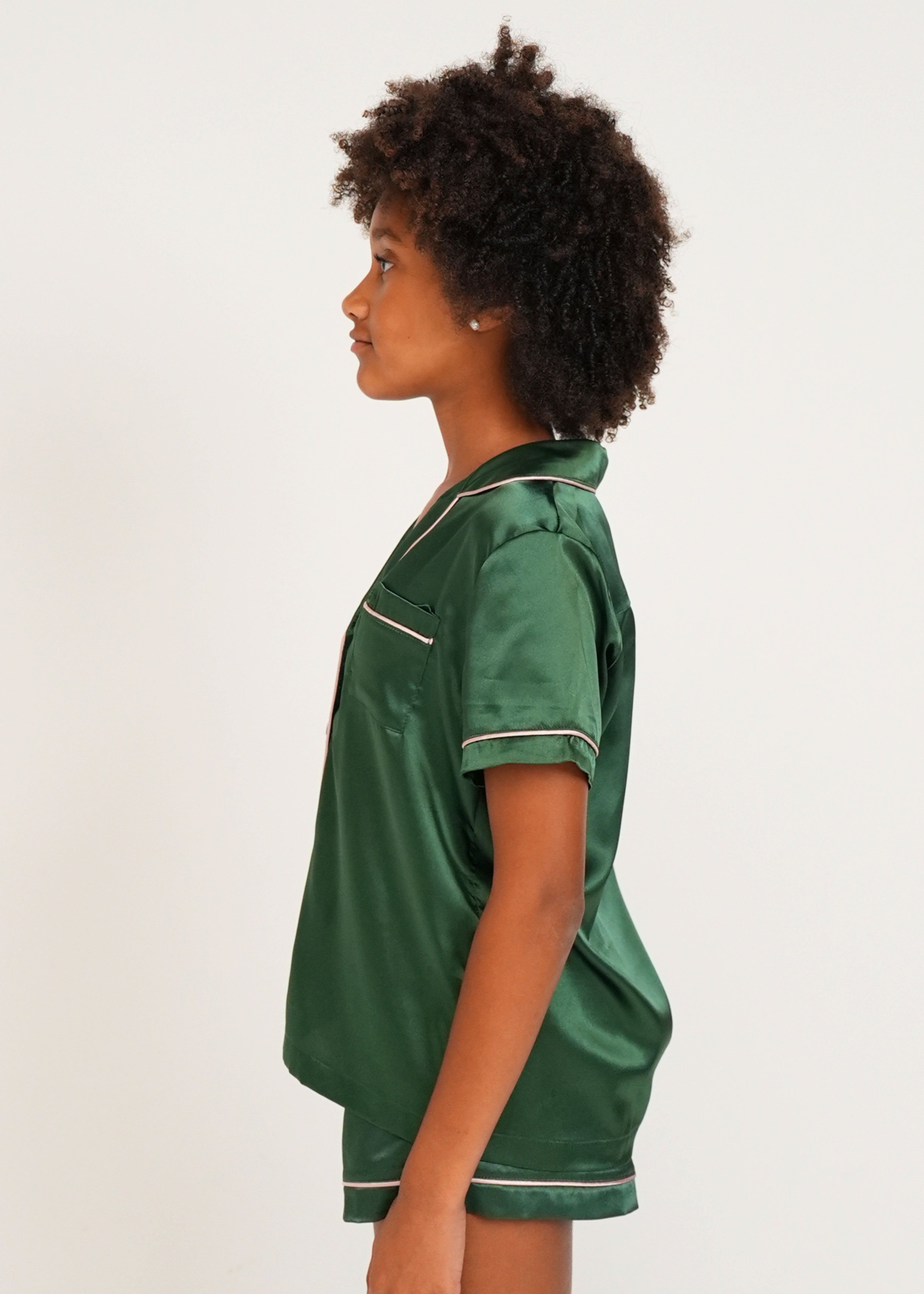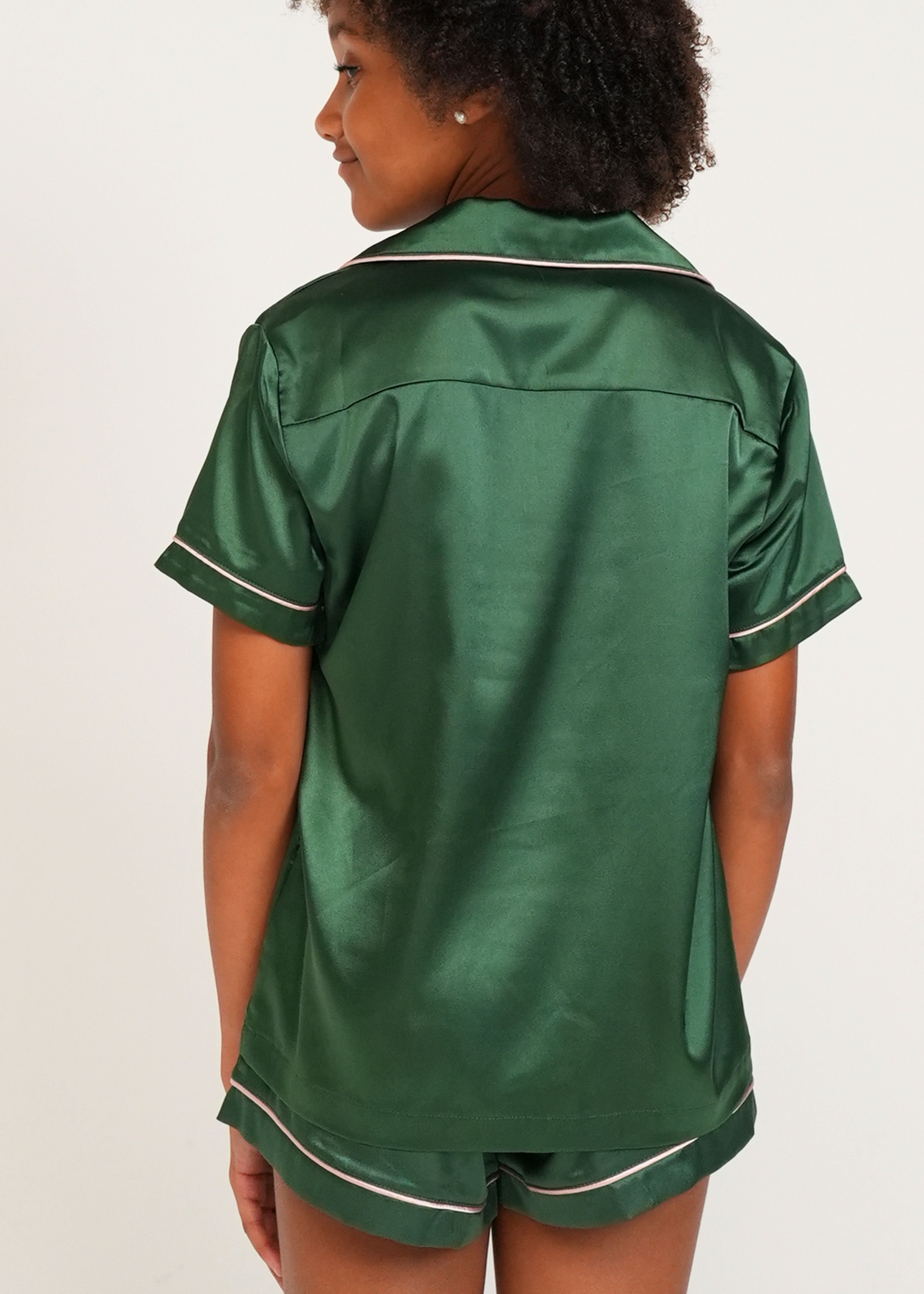 Indulge yourself in our luxuriously silky and oh so buttery soft Forest Green Satin Pyjamas. Lovingly detailed with deep pockets, adorable buttons, and an extra stretchy drawstring waistband for the ultimate comfort experience.