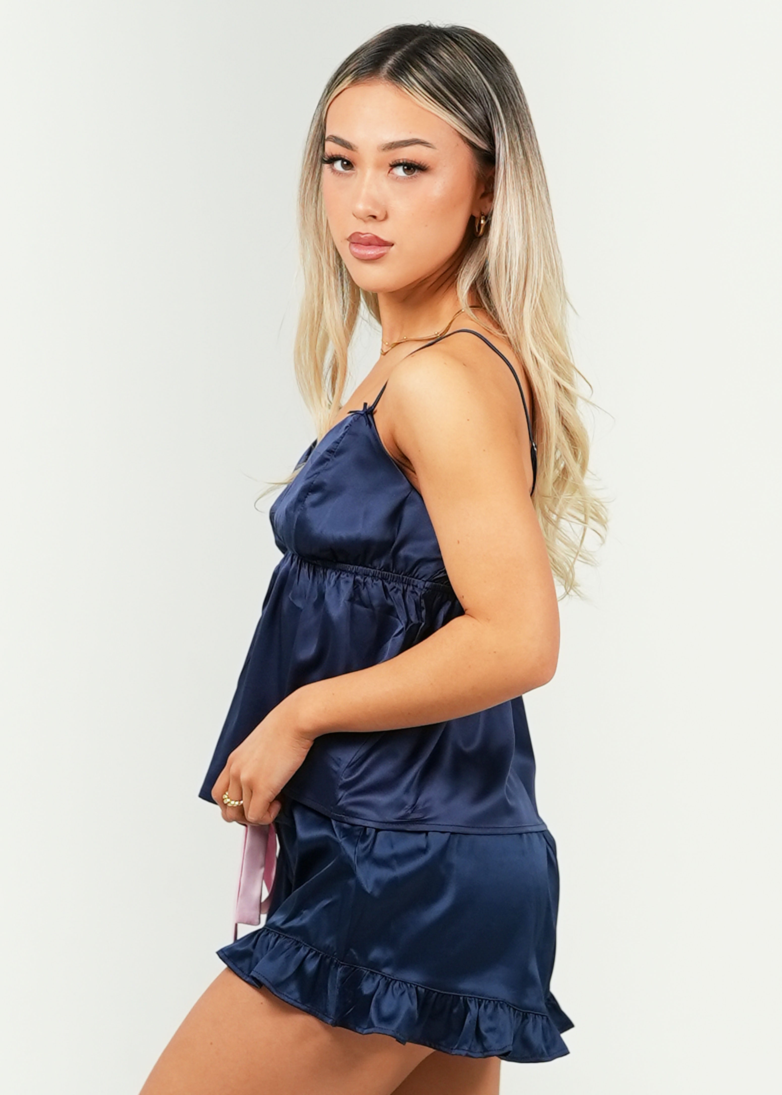Add a touch of summer goodness to your bedtime with our gorgeous Matte Navy Satin Camisole Pyjamas. Fashioned with the cutest frill detailed shorts, adjustable straps and flattering neckline, you are sure to have the sweetest sleep!