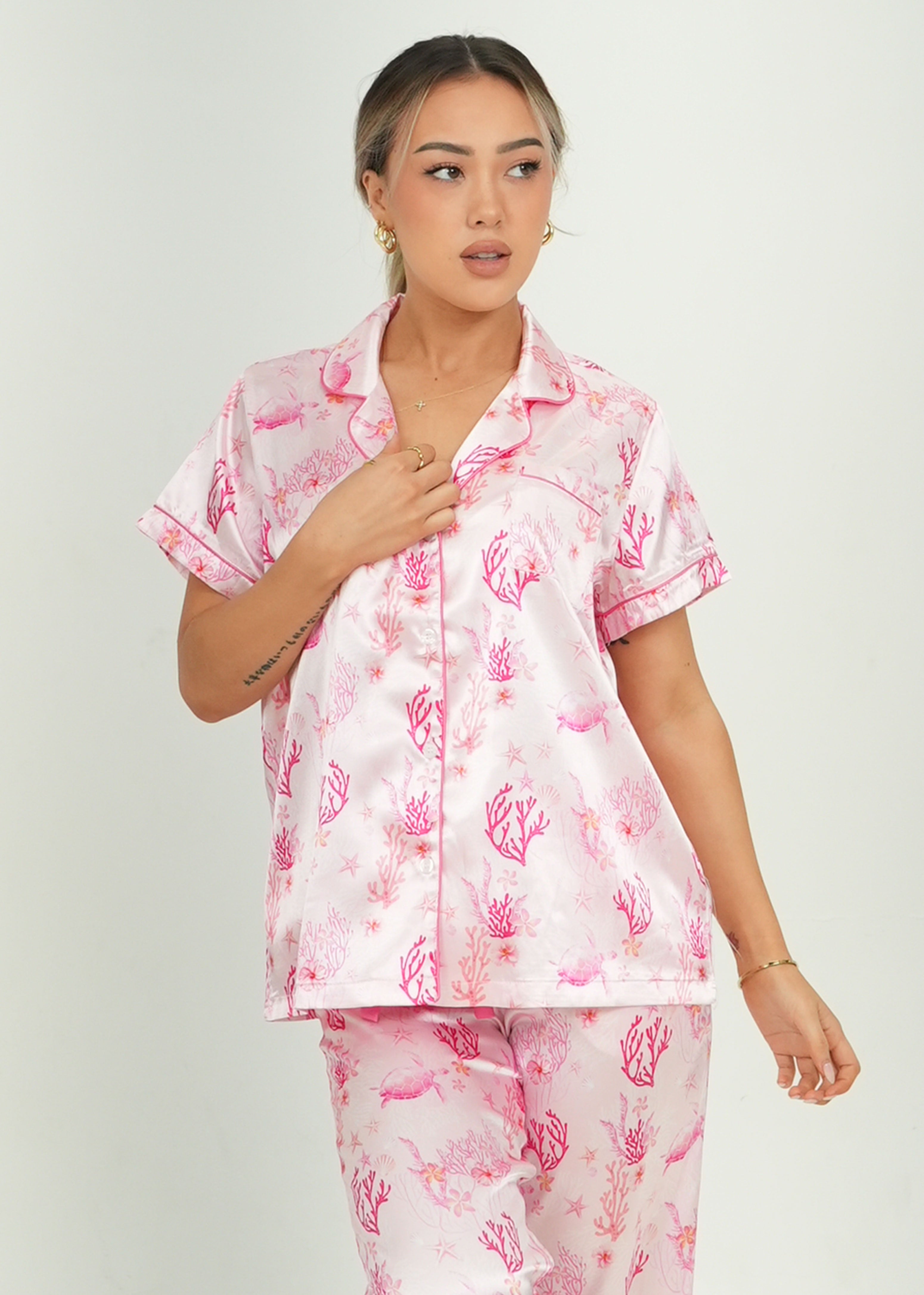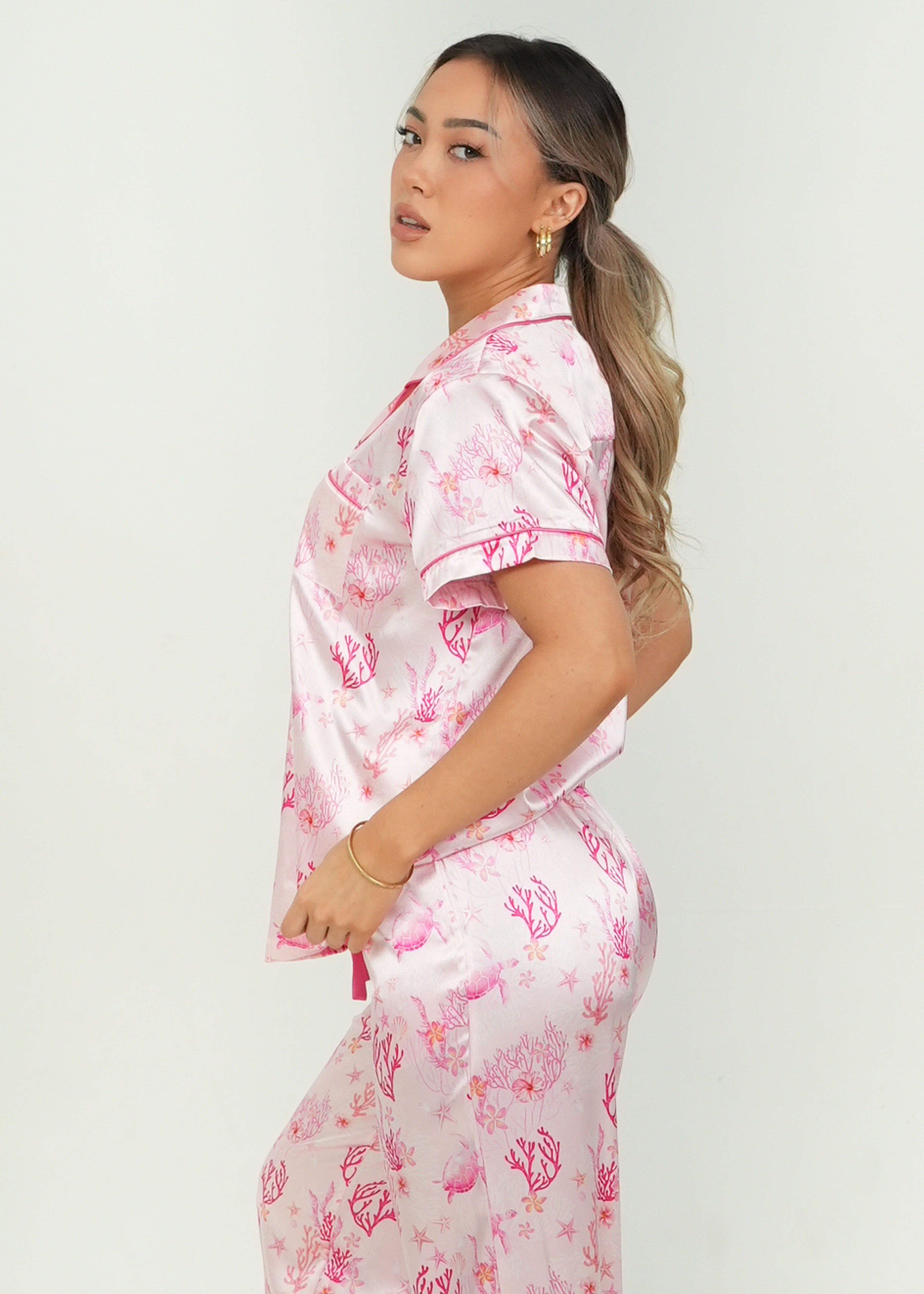 Indulge yourself in our luxuriously silky and oh so buttery soft Pink Garden Under the Sea Pjs. Lovingly detailed with deep pockets, adorable buttons, and an extra stretchy drawstring waistband for the ultimate comfort experience.