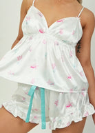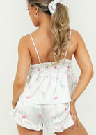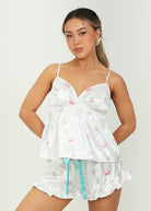Add a touch of goodness to your bedtime with our gorgeous White Turtles Satin Camisole Pyjamas. Fashioned with the cutest frill detailed shorts, adjustable straps and flattering neckline, you are sure to have the sweetest sleep!